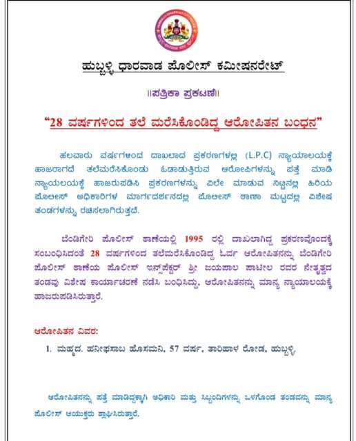 ಹುಬ್ಬಳ್ಳಿ: ಕಳೆದ 28 ವರ್ಷಗಳಿಂದ ತಲೆಮರೆಸಿಕೊಂಡಿದ್ದ ಆರೋಪಿಯನ್ನ ಬೆಂಡಿಗೇರಿ ಠಾಣೆಯ ಇನ್ಸಪೆಕ್ಟರ್ ಜಯಪಾಲ ಪಾಟೀಲ ಅವರ ತಂಡ ಬಂಧನ ಮಾಡುವಲ್ಲಿ ಯಶಸ್ವಿಯಾಗಿದ್ದಾರೆ.
