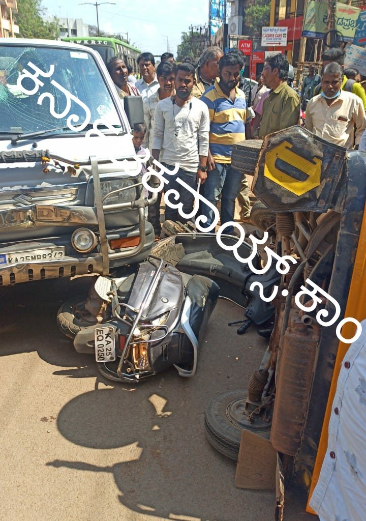 ಹುಬ್ಬಳ್ಳಿಯ ಕೋರ್ಟ ಸರ್ಕಲ್ ಬಳಿಯಿಂದ ಕೇಶ್ವಾಪುರದತ್ತ ಹೊರಟಿದ್ದ ಮಾರುತಿ ಓಮಿನಿ ಮೊದಲು ಸ್ಕೂಟಿಗೆ ಡಿಕ್ಕಿ ಹೊಡೆದಿದೆ. ಪರಿಣಾಮ ಬೈಕ್ ಸವಾರ ಅರಿಹಂತದಲ್ಲಿ ಕಾರ್ಯನಿರ್ವಹಿಸುವ ರಾಜೇಶ ಎಂಬಾತ ಕೆಳಗೆ ಬಿದ್ದಿದ್ದಾನೆ. ಅದೇ ಸಮಯದಲ್ಲಿ ರಾಂಗ್ ರೂಟಲ್ಲಿ ಬಂದ್ ಆಟೋ ಚಾಲಕ ಮಂಜುಪ್ಪ ಕರಲಳ್ಳಿಗೂ ಓಮಿನಿ ಡಿಕ್ಕಿ ಹೊಡೆದಿದೆ. ಇದರಿಂದ ಆಟೋ ಪಲ್ಟಿಯಾಗಿದೆ.