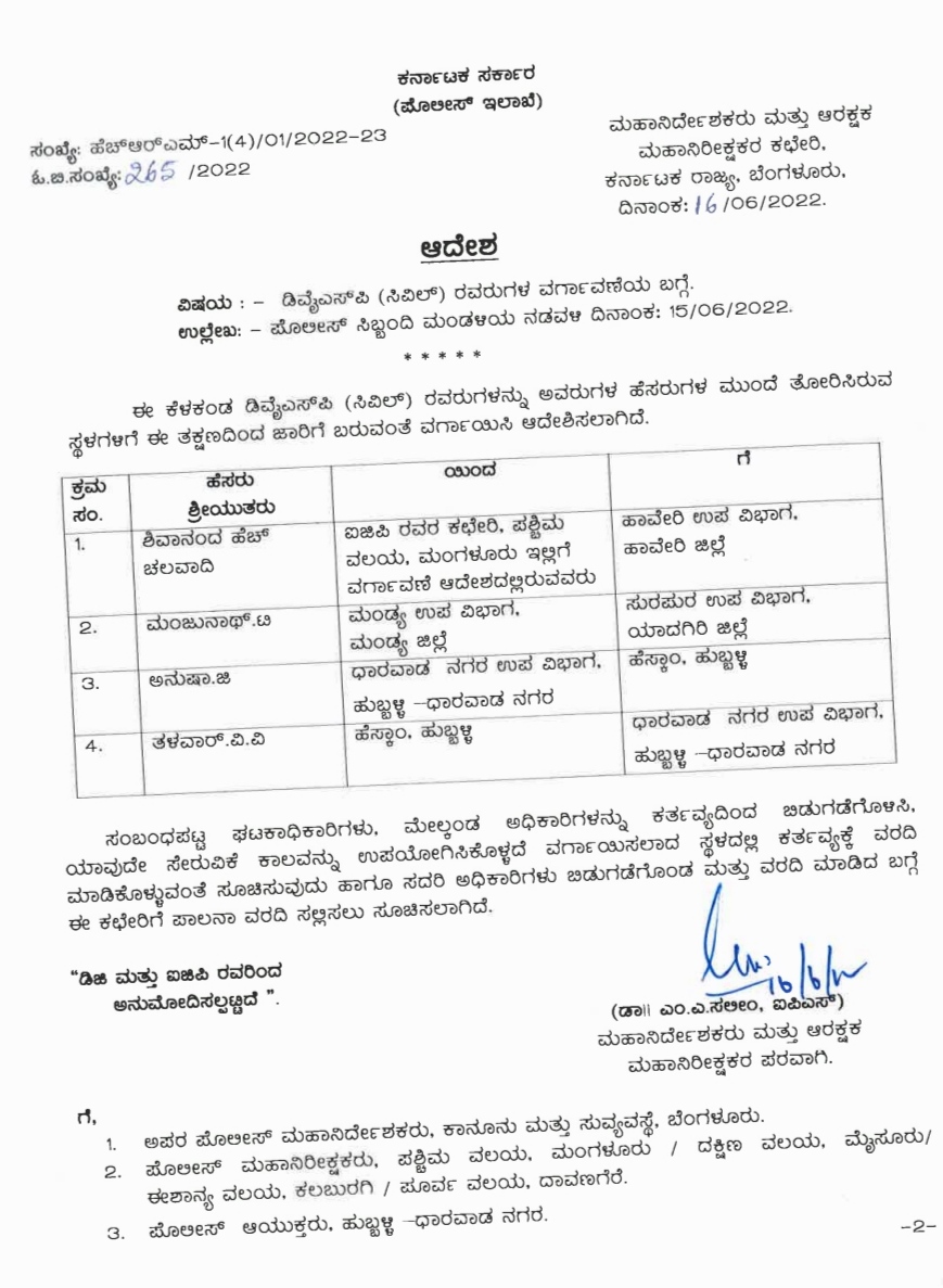 ಧಾರವಾಡ ನಗರ ಉಪ ವಿಭಾಗದ ಎಸಿಪಿಯಾಗಿದ್ದ ಜೆ.ಅನುಷಾ ಅವರನ್ನ ಹುಬ್ಬಳ್ಳಿಯ ಹೆಸ್ಕಾಂಗೆ ವರ್ಗಾವಣೆ ಮಾಡಲಾಗಿದ್ದು, ಅವರ ಜಾಗಕ್ಕೆ ವಿಜಯಕುಮಾರ ತಳವಾರ ಅವರನ್ನ ಹುಬ್ಬಳ್ಳಿ ಹೆಸ್ಕಾಂನಿಂದ ವರ್ಗಾವಣೆ ಮಾಡಲಾಗಿದೆ.