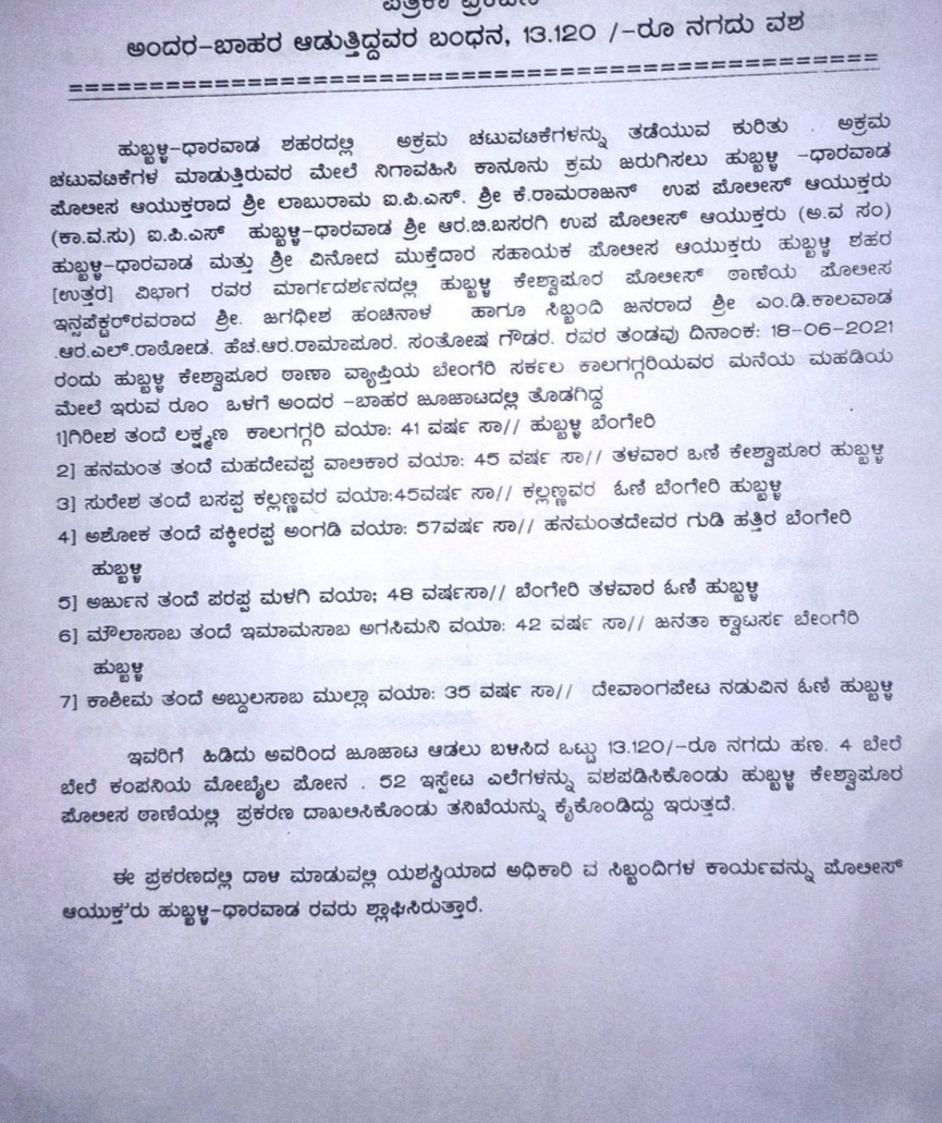 ಬಂಧಿತರಿಂದ 13120 ರೂಪಾಯಿ ನಗದು, ನಾಲ್ಕು ವಿವಿಧ ಕಂಪನಿಗಳ ಮೊಬೈಲ್ ಹಾಗೂ ಇಸ್ಪೀಟ್ ಎಲೆಗಳನ್ನ ವಶಕ್ಕೆ ಪಡೆಯಲಾಗಿದೆ. ಕೇಶ್ವಾಪುರ ಠಾಣೆಯ ಇನ್ಸಪೆಕ್ಟರ್ ಜಗದೀಶ ಹಂಚಿನಾಳ ನೇತೃತ್ವದಲ್ಲಿ ಸಿಬ್ಬಂದಿಗಳು ದಾಳಿ ಮಾಡಿ, ಆರೋಪಿಗಳನ್ನ ಬಂಧನ ಮಾಡಿದ್ದಾರೆ.