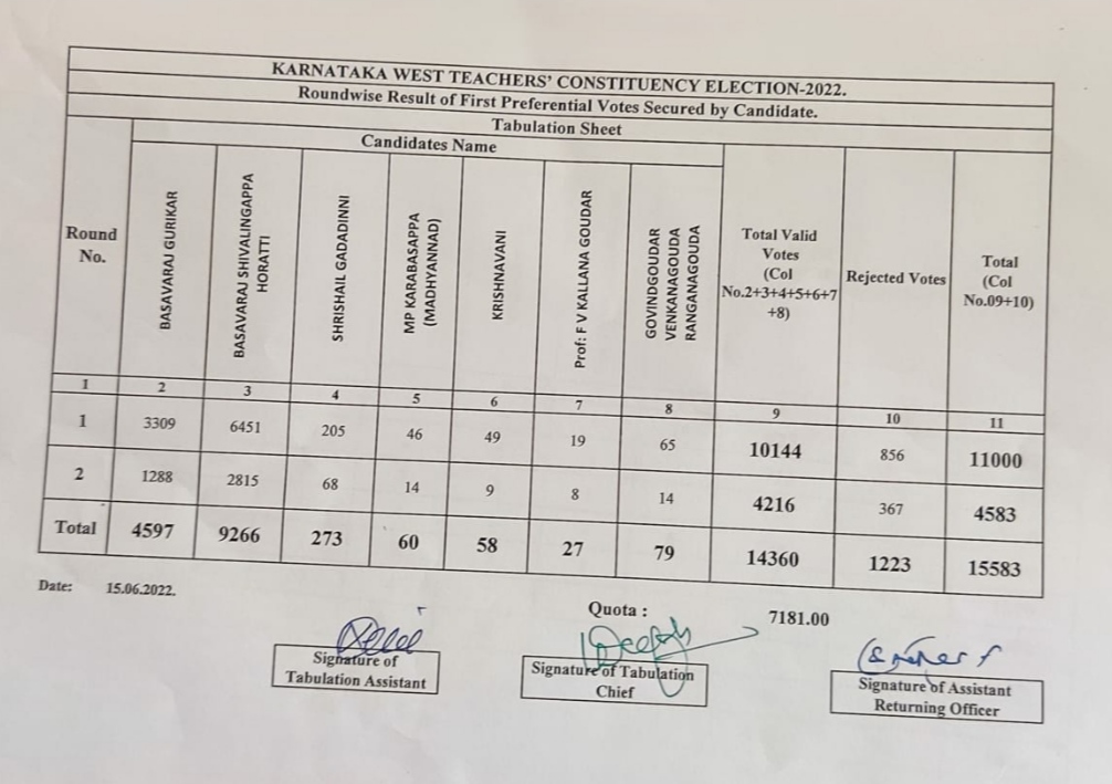 ಭಾರತೀಯ ಜನತಾ ಪಕ್ಷದಿಂದ ಅಭ್ಯರ್ಥಿಯಾಗಿದ್ದ ಬಸವರಾಜ ಹೊರಟ್ಟಿಯವರು ಈ ಬಾರಿ 9266 ಮತಗಳನ್ನ ಪಡೆದಿದ್ದಾರೆ. ಕಾಂಗ್ರೆಸ್ ಅಭ್ಯರ್ಥಿ ಬಸವರಾಜ ಗುರಿಕಾರ 4597 ಮತಗಳನ್ನ ಪಡೆದಿದ್ದು, ಹೊರಟ್ಟಿಯವರು 4669 ಮತಗಳ ಅಂತರದಿಂದ ಗೆಲುವು ಸಾಧಿಸಿದ್ದಾರೆ.