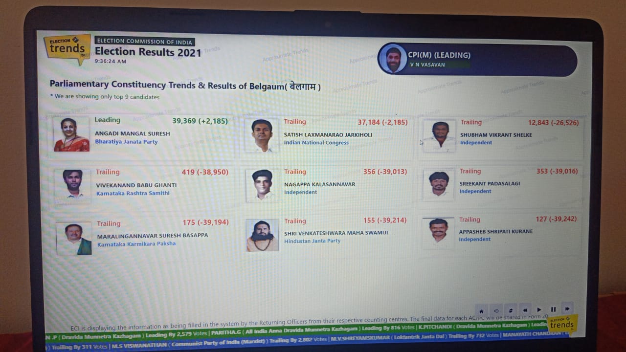 ಭಾರತೀಯ ಜನತಾ ಪಕ್ಷದ ಮಂಗಳಾ ಅಂಗಡಿಯವರ 39369 ಮತಗಳನ್ನ ಪಡೆದು, 2185 ಮತಗಳನ್ನ ಅಂತರದಿಂದ ಮುಂದಿದ್ದಾರೆ. ಕಾಂಗ್ರೆಸ್ ನ ಸತೀಶ ಜಾರಕಿಹೊಳಿ ಅವರು 37184 ಮತಗಳನ್ನ ಪಡೆದು ಹಿನ್ನಡೆ ಸಾಧಿಸಿದ್ದಾರೆ. ದಿವಂಗತ ಸುರೇಶ ಅಂಗಡಿಯವರ ಮಡದಿಯವರು ಮೊದಲ ಭಾರಿಗೆ ಮುನ್ನಡೆ ಸಾಧಿಸಿದ್ದು, ಟ್ರೆಂಡ್ ಬದಲಾಗಬಹುದೆಂಬ ನಿರೀಕ್ಷೆಯಿದೆ ಎಂದು ಹೇಳಲಾಗಿದೆ.
