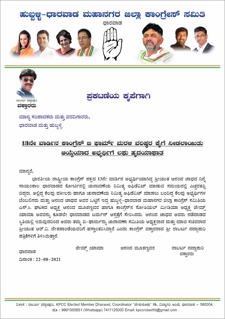 ಈ ಹಿನ್ನೆಲೆಯಲ್ಲಿ ಆನಂದ ಜಾಧವ ಅವರ ಭೀ ಫಾರ್ಮ ಮರಳಿ ಪಡೆದಿದ್ದು, ಪಕ್ಷದಲ್ಲಿ ಬಂಡಾಯವೆದ್ದಿದ್ದ ಹೇಮಂತ ಗುರ್ಲಹೊಸೂರ ಅವರಿಗೆ ನೀಡಿದ್ದಾರೆ ಎಂದು ಹೇಳಲಾಗಿದೆ.