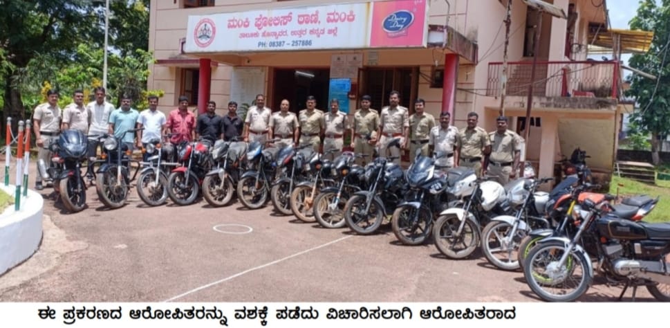 ಭಟ್ಕಳ: ಉತ್ತರಕನ್ನಡ ಜಿಲ್ಲೆಯ ವಿವಿಧೆಡೆಗಳಲ್ಲಿ ಹತ್ತಾರು ಬೈಕ್ ಕಳ್ಳತನ ಮಾಡಿದ್ದ ನಾಲ್ವರು ಆರೋಪಿಗಳನ್ನ ಬಂಧಿಸಿ 15ಬೈಕ್ ಗಳನ್ನ ಮಂಕಿ ಠಾಣೆ ಪೊಲೀಸರು ವಶಕ್ಕೆ ಪಡೆಯುವಲ್ಲಿ ಯಶಸ್ವಿಯಾಗಿದ್ದಾರೆ.