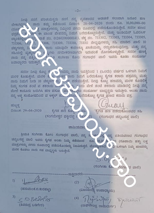 ಗಂಗಾಧರ ವಾಲಿಯವರು ತೀರಿಕೊಳ್ಳುವ ಮುನ್ನವೇ ಬಾಂಡವೊಂದನ್ನ ಮಾಡಿಕೊಂಡಿದ್ದು, ಅದರಲ್ಲಿ 10 ಲಕ್ಷ ರೂಪಾಯಿ ಕೈಗಡ ಎಂದು ಬರೆಯಲಾಗಿದೆ. ಒಂದು ವರ್ಷದಲ್ಲಿ ಅದರ ಬಡ್ಡಿ ಸಮೇತ 17 ಲಕ್ಷಕ್ಕೂ ಹೆಚ್ಚು ಹಣವನ್ನ ಕೊಡುವಂತೆ ಪೀಡಿಸುತ್ತಿರುವುದರಿಂದ ಪ್ರಕರಣ ಬೆಳಕಿಗೆ ಬಂದಿದೆ.