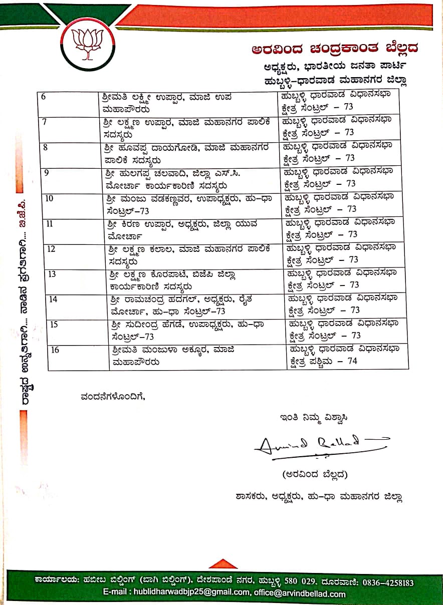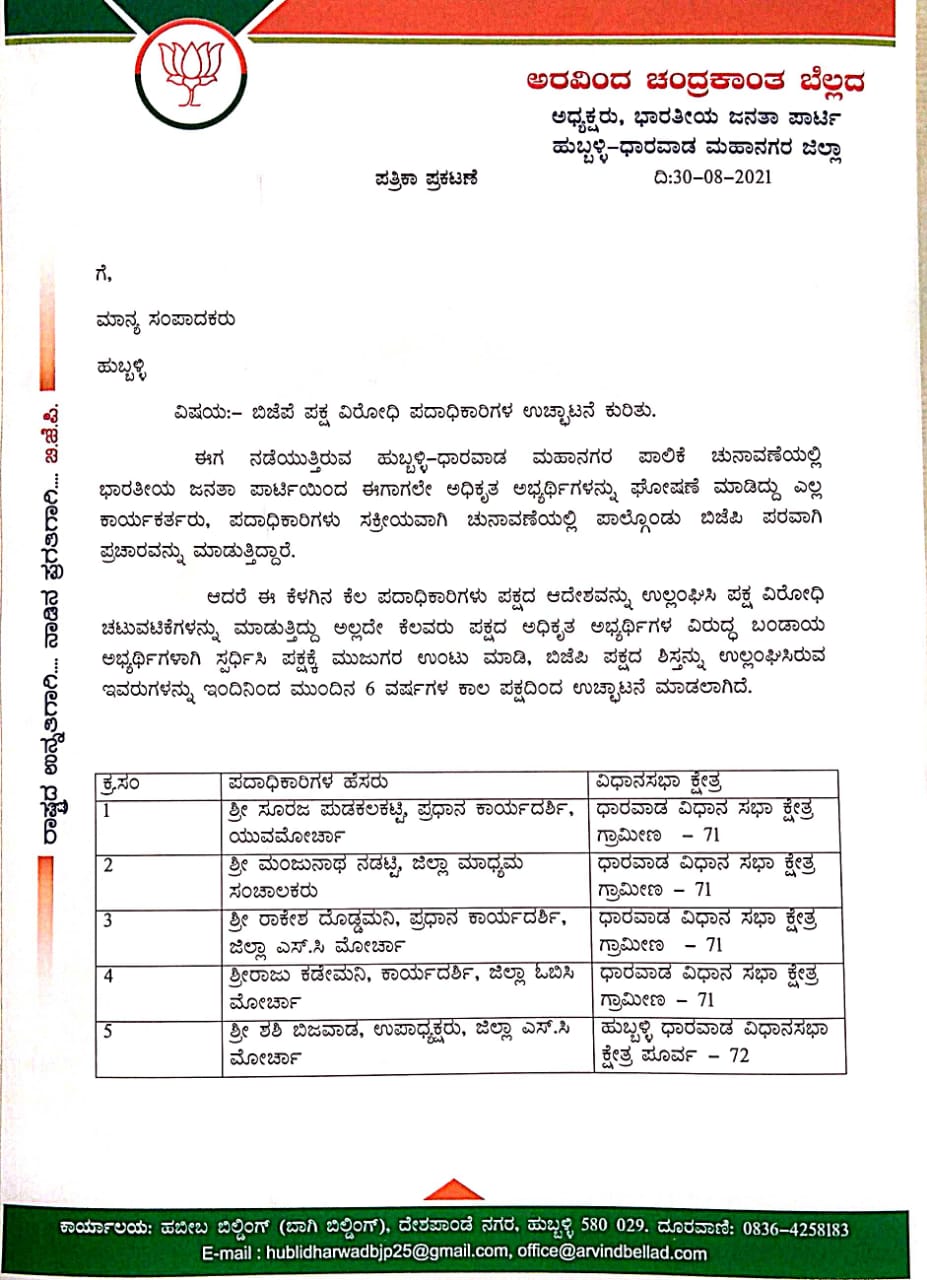ಮಾಜಿ ಮೇಯರ ಮಂಜುಳಾ ಅಕ್ಕೂರ, ಉಪ ಮೇಯರ್ ಲಕ್ಷ್ಮೀ ಉಪ್ಪಾರ, ಮಾಜಿ ಸದಸ್ಯರುಗಳಾದ ಲಕ್ಷ್ಮಣ ಉಪ್ಪಾರ, ಹೂವಪ್ಪ ದಾಯಗೋಡಿ, ಸೇರಿದಂತೆ ಉಪ್ಪಾರ ದಂಪತಿಗಳ ಪುತ್ರ ಕಿರಣ ಉಪ್ಪಾರ, ಶಶಿಕಾಂತ ಬಿಜವಾಡ ಸೇರಿದಂತೆ ಒಟ್ಟು 16 ಜನರನ್ನ ಪಕ್ಷದಿಂದ 6 ವರ್ಷಕ್ಕೆ ಉಚ್ಚಾಟನೆ ಮಾಡಿ, ಮಹಾನಗರ ಜಿಲ್ಲಾಧ್ಯಕ್ಷ ಅರವಿಂದ ಬೆಲ್ಲದ ಆದೇಶ ಹೊರಡಿಸಿದ್ದಾರೆ.