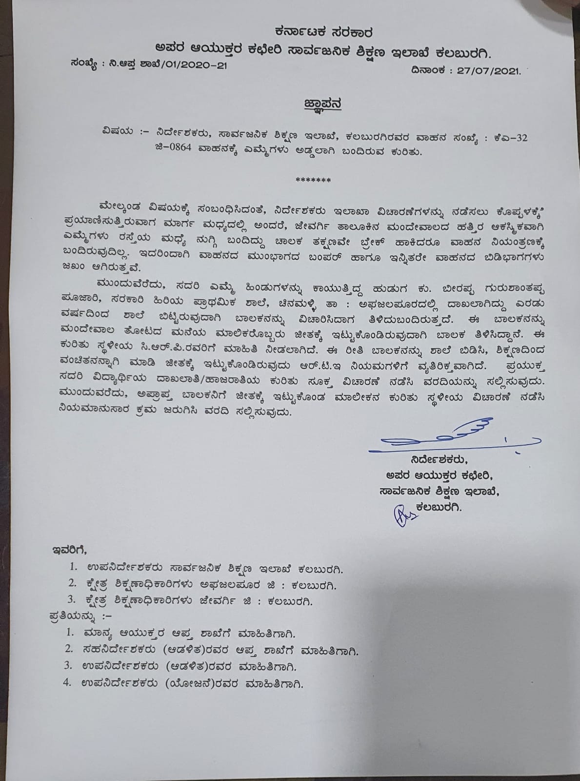 ಕಲಬುರಗಿ: ಶಿಕ್ಷಣ ಇಲಾಖೆ ನಿರ್ದೇಶಕರ ಕಾರಿಗೆ ಎಮ್ಮೆ ಡಿಕ್ಕಿ ಹೊಡೆದ ಪ್ರಕರಣವೊಂದು ಭಾರಿ ಸುದ್ದಿಯಾಗಿದ್ದು, ಈ ಕುರಿತು ಶಿಕ್ಷಣಾಧಿಕಾರಿಗಳು ಬರೆದ ಪತ್ರ ಸಾಮಾಜಿಕ ಜಾಲತಾಣಗಳಲ್ಲಿ ವೈರಲ್ ಆಗಿದೆ.
