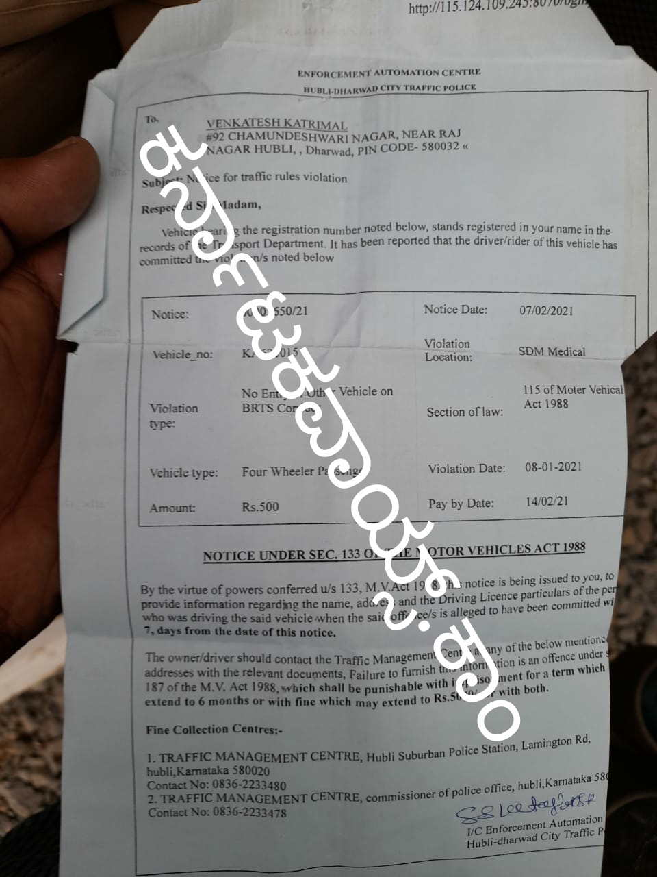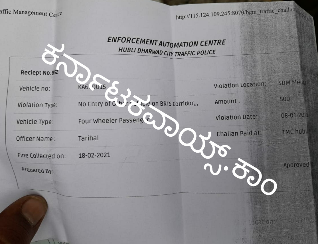 ಧಾರವಾಡದಿಂದ ಹುಬ್ಬಳ್ಳಿಗೆ ಜನವೇರಿ 8ರಂದು ಹೋಗುವಾಗ ಧಾರವಾಡದ ಎಸ್ ಡಿಎಂ ಆಸ್ಪತ್ರೆ ಮುಂಭಾಗ, ಬಿಆರ್ ಟಿಎಸ್ ಮಾರ್ಗದಲ್ಲಿ ವಾಹನ ಹೋಗಿದೆ ಎಂದು ನೋಟೀಸನ್ನ ಬಿಆರ್ ಟಿಎಸ್ ಪೊಲೀಸರಿಗೆ ಮಾಹಿತಿಯನ್ನ ನೀಡಿದೆ. ಬಿಆರ್ ಟಿಎಸ್ ಮಾರ್ಗದಲ್ಲಿ ಅವರದ್ದೆ ಸಿಸಿಟಿವಿ ಇರುವುದರಿಂದ, ಆ ಮಾರ್ಗದಲ್ಲಿ ಹೋದ ವಾಹನಗಳ ಬಗ್ಗೆ ಮಾಹಿತಿ ಅವರಿಗಷ್ಟೇ ಇರುತ್ತದೆ.
