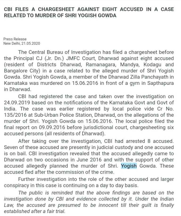 ಧಾರವಾಡ: ಭಾರತೀಯ ಜನತಾ ಪಕ್ಷದ ಜಿಲ್ಲಾ ಪಂಚಾಯತ್ ಸದ್ಯಸ ಯೋಗೇಶ್ ಗೌಡ ಕೊಲೆ ಪ್ರಕರಣಕ್ಕೆ ಸಂಬಂಧಿಸಿದಂತೆ ಒಂದು ಹಂತದ ತನಿಖೆ‌ಯನ್ನ ಸಿಬಿಐ ಪೂರ್ಣಗೊಳಿಸಿದ್ದು, 14 ಜನರ ವಿರುದ್ಧ...