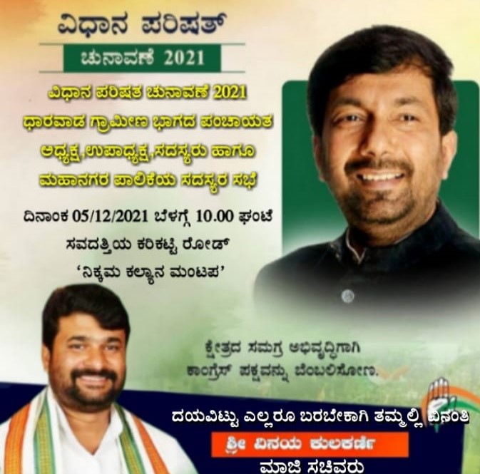 ಧಾರವಾಡ: ಸ್ಥಳೀಯ ಸಂಸ್ಥೆಗಳ ವಿಧಾನಪರಿಷತ್ ಚುನಾವಣೆಯ ಅಂಗವಾಗಿ ಮಾಜಿ ಸಚಿವ ವಿನಯ ಕುಲಕರ್ಣಿಯವರು, ಸವದತ್ತಿಯಲ್ಲಿ ಡಿಸೆಂಬರ್ ಪ್ರಚಾರವನ್ನ ನಡೆಸಲಿದ್ದಾರೆ. ಡಿಸೆಂಬರ್ 5ರಂದು ಸವದತ್ತಿಯ ಕರಿಕಟ್ಟಿ ರಸ್ತೆಯಲ್ಲಿರುವ ನಿಕ್ಕಂ...