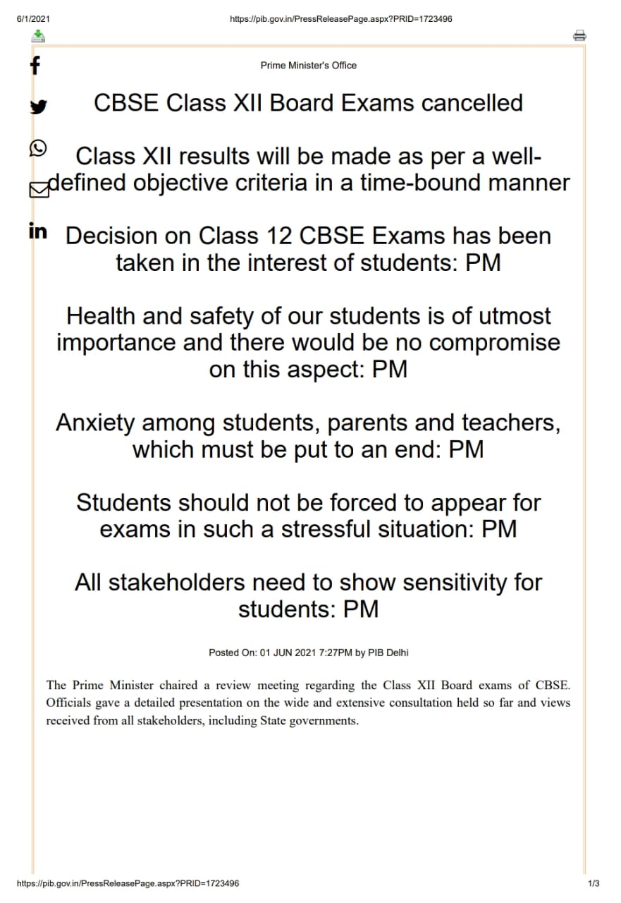 ಸಿಬಿಎಸ್ಸಿ ದ್ವೀತಿಯ ಪಿಯುಸಿ ಪರೀಕ್ಷೆ ರದ್ದು: ಪ್ರಧಾನಿ ಘೋಷಣೆ…!