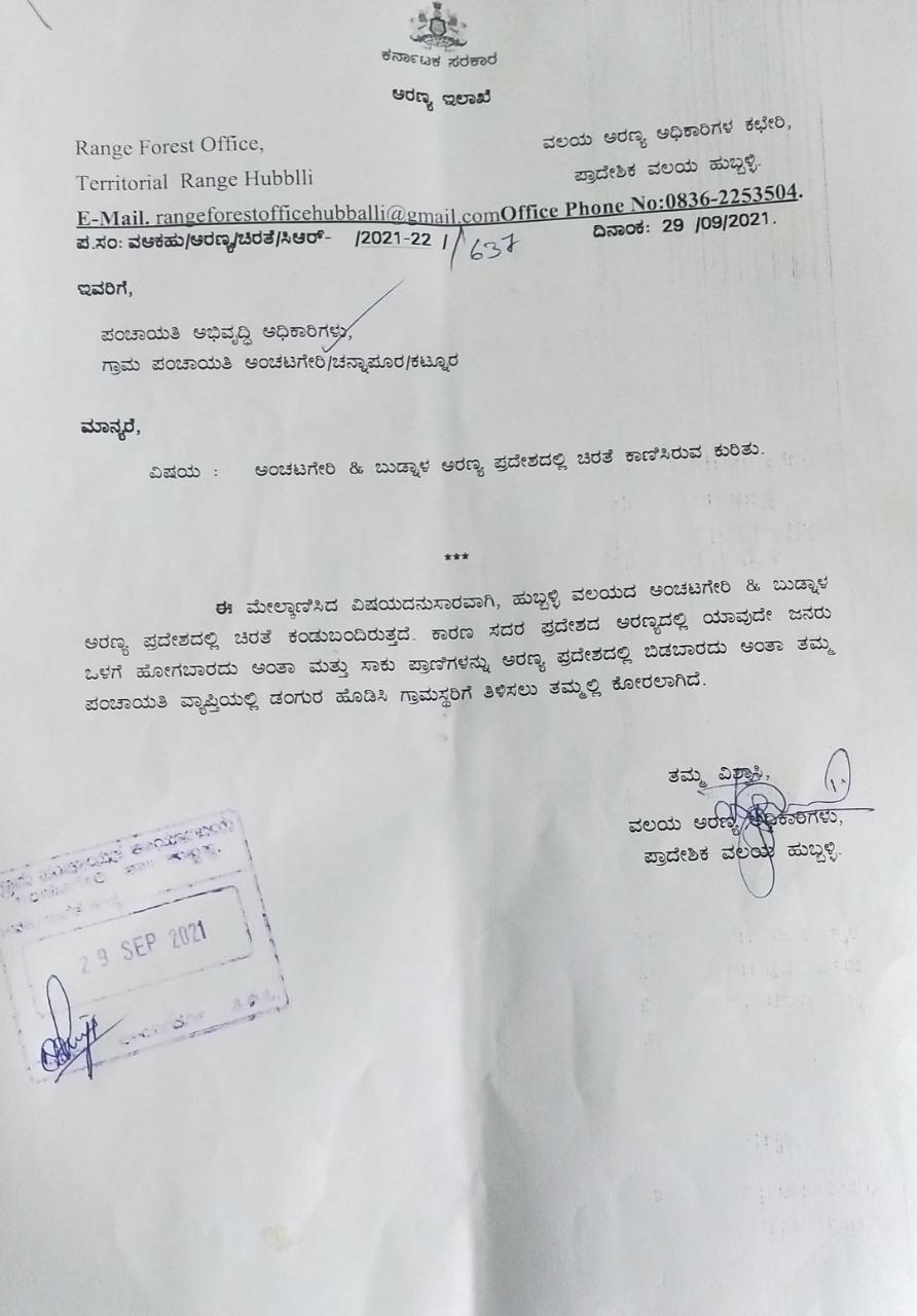 ನಿನ್ನೆಯಷ್ಟೇ ಹುಬ್ಬಳ್ಳಿ ಪ್ರಾದೇಶಿಕ ವಲಯದ ಅರಣ್ಯ ಅಧಿಕಾರಿಗಳು ಅಂಚಟಗೇರಿ, ಚೆನ್ನಾಪುರ ಹಾಗೂ ಕಟ್ನೂರ ಗ್ರಾಮ ಪಂಚಾಯತಿ ಪಿಡಿಓಗಳಿಗೆ ಪತ್ರವನ್ನ ಬರೆದು, ಅಂಚಟಗೇರಿ ಮತ್ತು ಬುಡ್ನಾಳ ಗ್ರಾಮದಲ್ಲಿ ಚಿರತೆ ಕಂಡು ಬಂದಿದೆ ಎಂದು ತಿಳಿಸಿ, ಜಾಗೃತೆ ವಹಿಸಲು ಸೂಚನೆ ನೀಡಲಾಗಿತ್ತು.