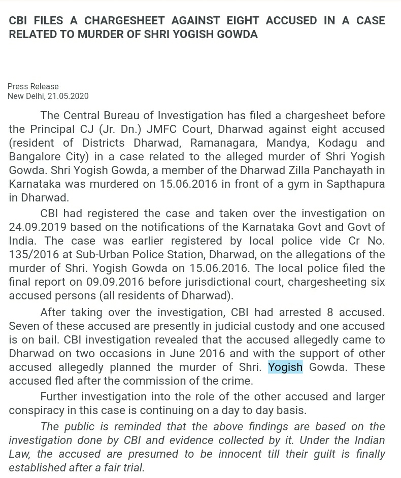 ಯೋಗೇಶಗೌಡ ಕೊಲೆ ಪ್ರಕರಣ: ಸಿಬಿಐನಿಂದ 14ಜನರ ವಿರುದ್ಧ ದೋಷಾರೋಪ ಪಟ್ಟಿ: ತನಿಖೆ ಇನ್ನೂ ಜಾರಿಯಲ್ಲಿದೆ
