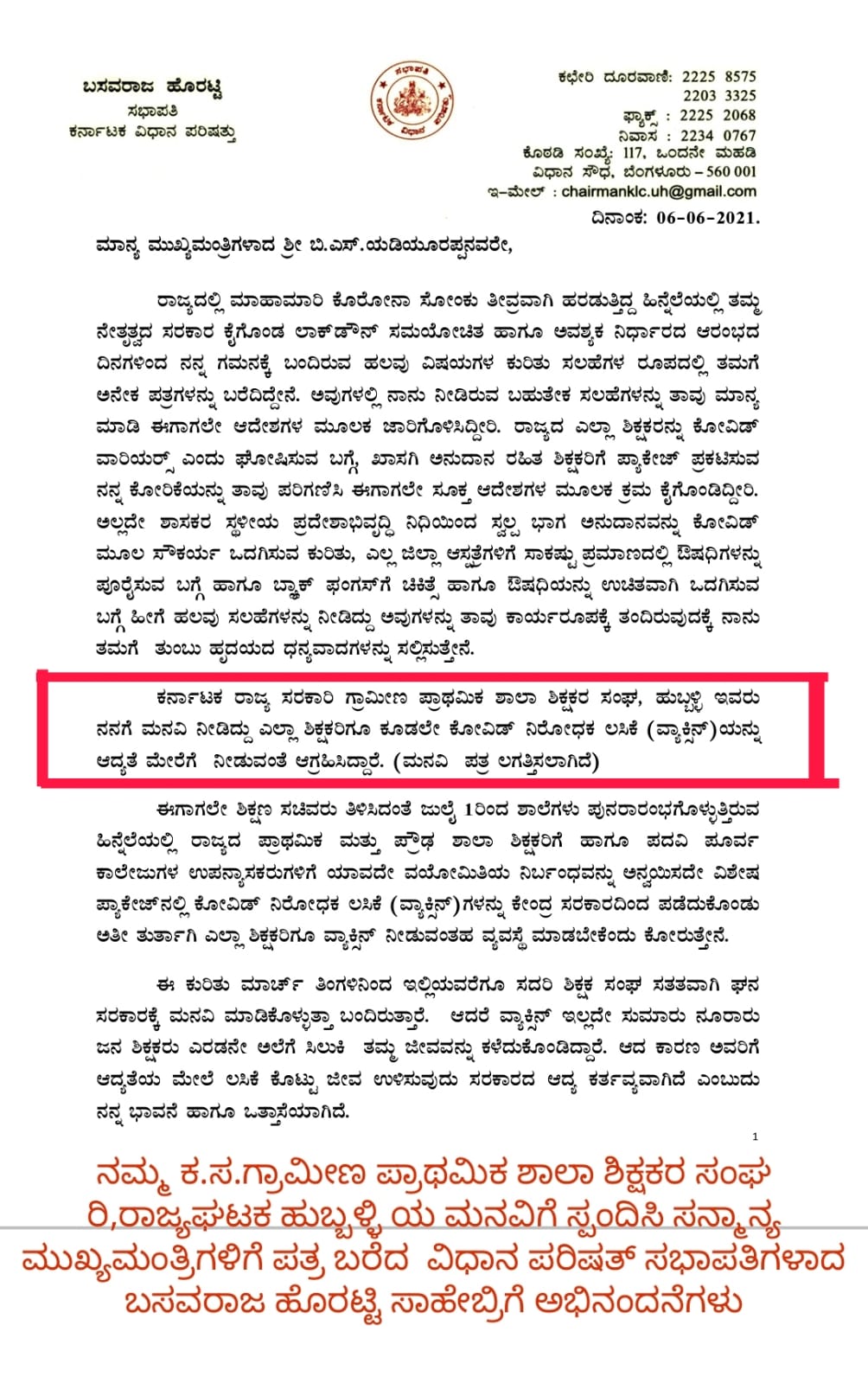 ಈಗಾಗಲೇ ಶಿಕ್ಷಣ ಸಚಿವರು ತಿಳಿಸಿದಂತೆ ಜುಲೈ ೧ರಿಂದ ಶಾಲೆಗಳು ಪುನರಾರಂಭಗೊಳ್ಳುತ್ತಿರುವ ಹಿನ್ನೆಲೆಯಲ್ಲಿ ರಾಜ್ಯದ ಪ್ರಾಥಮಿಕ ಮತ್ತು ಪ್ರೌಢ ಶಾಲಾ ಶಿಕ್ಷಕರಿಗೆ ಹಾಗೂ ಪದವಿ ಪೂರ್ವ ಕಾಲೇಜುಗಳ ಉಪನ್ಯಾಸಕರುಗಳಿಗೆ ಯಾವದೇ ವಯೋಮಿತಿಯ ನಿರ್ಬಂಧವನ್ನು ಅನ್ವಯಿಸದೇ ವಿಶೇಷ ಪ್ಯಾಕೇಜ್‌ನಲ್ಲಿ ಕೋವಿಡ್ ನಿರೋಧಕ ಲಸಿಕೆ (ವ್ಯಾಕ್ಸಿನ್)ಗಳನ್ನು ಕೇಂದ್ರ ಸರಕಾರದಿಂದ ಪಡೆದುಕೊಂಡು ಅತೀ ತುರ್ತಾಗಿ ಎಲ್ಲಾ ಶಿಕ್ಷಕರಿಗೂ ವ್ಯಾಕ್ಸಿನ್ ನೀಡುವಂತಹ ವ್ಯವಸ್ಥೆ ಮಾಡಬೇಕೆಂದು ಕೋರುತ್ತೇನೆ.