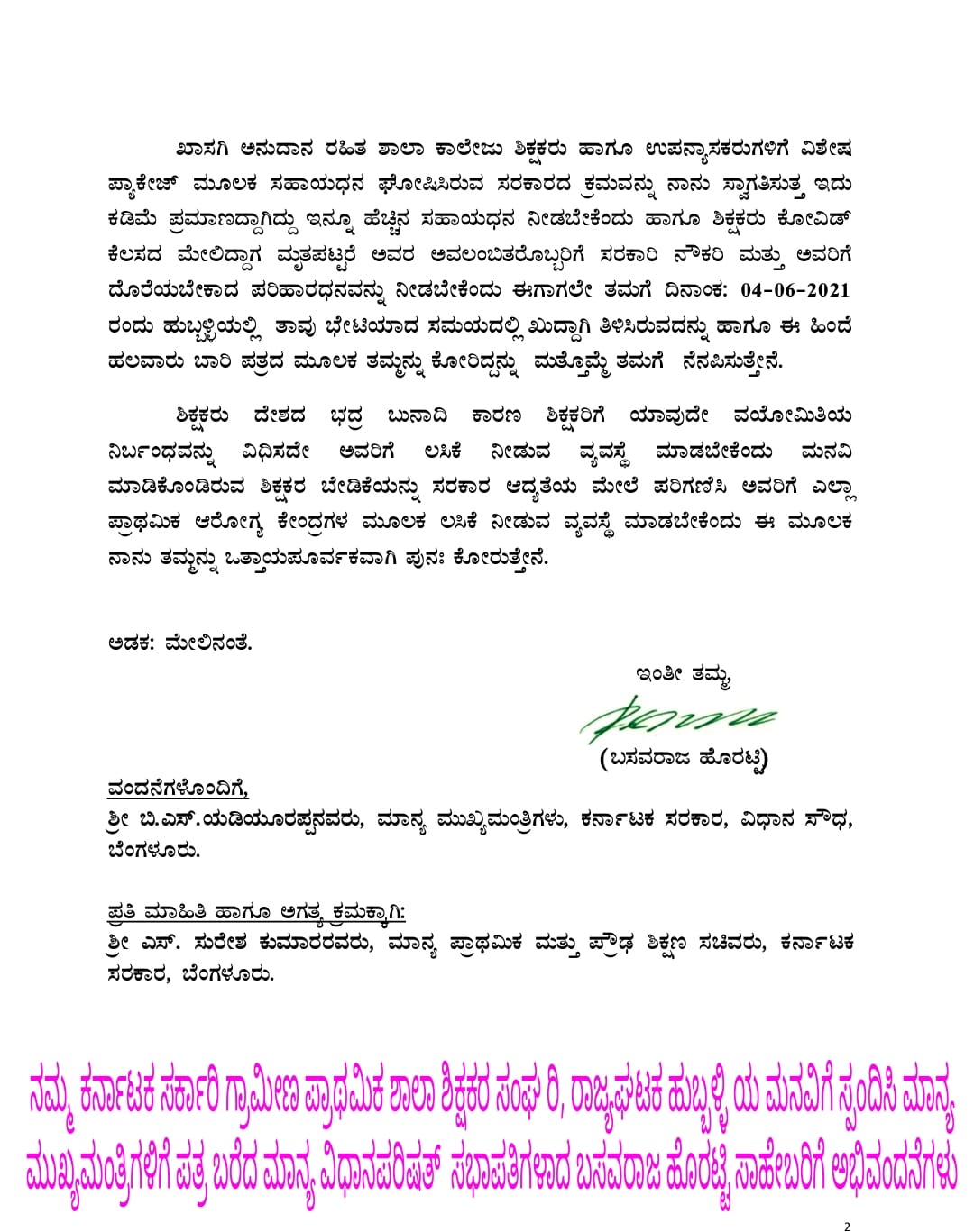 ಖಾಸಗಿ ಅನುದಾನ ರಹಿತ ಶಾಲಾ ಕಾಲೇಜು ಶಿಕ್ಷಕರು ಹಾಗೂ ಉಪನ್ಯಾಸಕರುಗಳಿಗೆ ವಿಶೇಷ ಪ್ಯಾಕೇಜ್ ಮೂಲಕ ಸಹಾಯಧನ ಘೋಷಿಸಿರುವ ಸರಕಾರದ ಕ್ರಮವನ್ನು ನಾನು ಸ್ವಾಗತಿಸುತ್ತ ಇದು ಕಡಿಮೆ ಪ್ರಮಾಣದ್ದಾಗಿದ್ದು ಇನ್ನೂ ಹೆಚ್ಚಿನ ಸಹಾಯಧನ ನೀಡಬೇಕೆಂದು ಹಾಗೂ ಶಿಕ್ಷಕರು ಕೋವಿಡ್ ಕೆಲಸದ ಮೇಲಿದ್ದಾಗ ಮೃತಪಟ್ಟರೆ ಅವರ ಅವಲಂಬಿತರೊಬ್ಬರಿಗೆ ಸರಕಾರಿ ನೌಕರಿ ಮತ್ತು ಅವರಿಗೆ ದೊರೆಯಬೇಕಾದ ಪರಿಹಾರಧನವನ್ನು ನೀಡಬೇಕೆಂದು ಈಗಾಗಲೇ ತಮಗೆ ದಿನಾಂಕ: ೦೪-೦೬-೨೦೨೧ ರಂದು ಹುಬ್ಬಳ್ಳಿಯಲ್ಲಿ ತಾವು ಭೇಟಿಯಾದ ಸಮಯದಲ್ಲಿ ಖುದ್ದಾಗಿ ತಿಳಿಸಿರುವದನ್ನು ಹಾಗೂ ಈ ಹಿಂದೆ ಹಲವಾರು ಬಾರಿ ಪತ್ರದ ಮೂಲಕ ತಮ್ಮನ್ನು ಕೋರಿದ್ದನ್ನು ಮತ್ತೊಮ್ಮೆ ತಮಗೆ ನೆನಪಿಸುತ್ತೇನೆ.