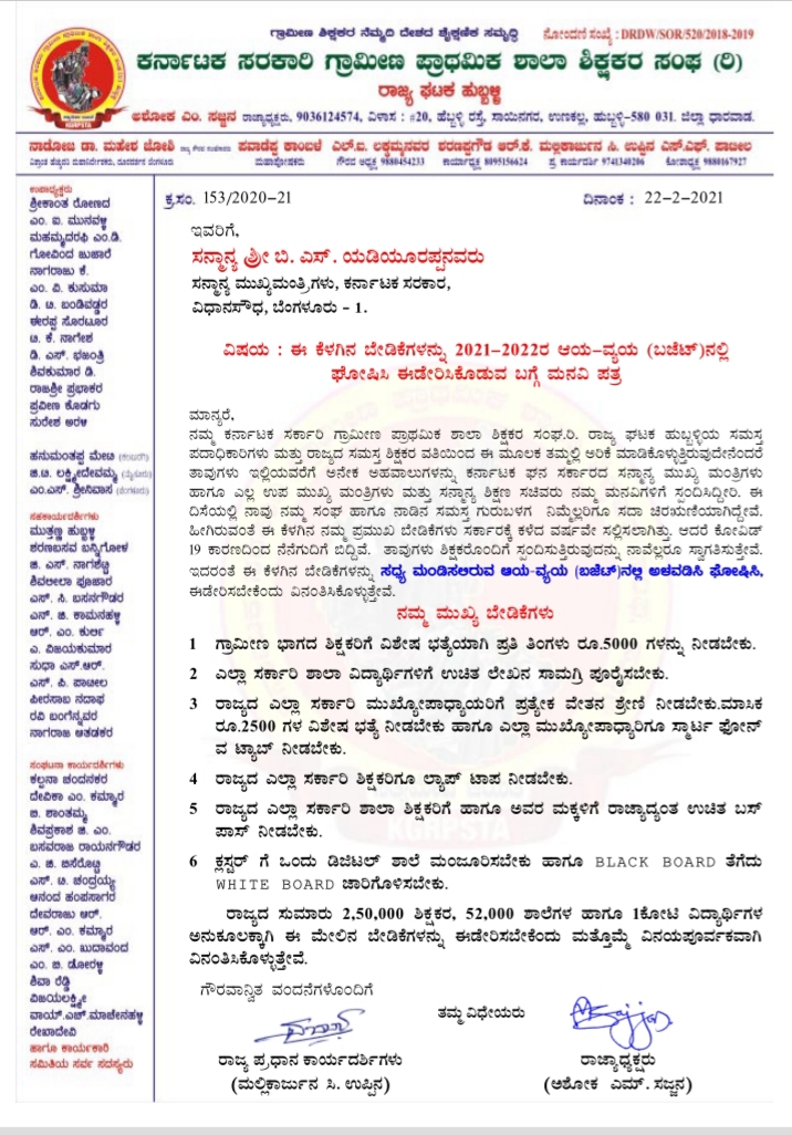 ಕರ್ನಾಟಕ ಸರಕಾರಿ ಗ್ರಾಮೀಣ ಪ್ರಾಥಮಿಕ ಶಾಲಾ ಶಿಕ್ಷಕರ ಸಂಘ ರಿ, ರಾಜ್ಯಘಟಕ ಹುಬ್ಬಳ್ಳಿಯ ಪದಾಧಿಕಾರಿಗಳು ಹಾಗೂ ರಾಜ್ಯದ ಶಿಕ್ಷಕರ ವತಿಯಿಂದ ಗ್ರಾಮೀಣ ಪ್ರದೇಶದಲ್ಲಿ ಸೇವೆ ಸಲ್ಲಿಸುತ್ತಿರುವ ಶಿಕ್ಷಕರ ಹಾಗೂ ಗ್ರಾಮೀಣ ಪ್ರದೇಶದಲ್ಲಿನ ಬಡ ಮಕ್ಕಳ ಕಾಳಜಿಯಿಂದ ಈ ಕೆಳಗಿನ ಬೇಡಿಕೆಗಳನ್ನು ಬಜೆಟ್ ನಲ್ಲಿ ಅಳವಡಿಸಿ ಘೋಷಿಸುವಂತೆ ಸರ್ಕಾರಕ್ಕೆ ಒತ್ತಾಯಿಸಿದ್ದಾರೆ
