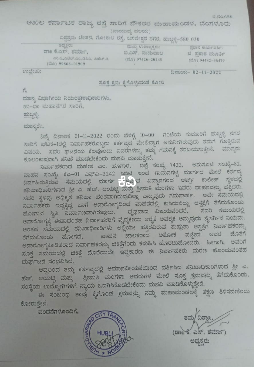 ಮೃತ ನಿರ್ವಾಹಕ ಮಹೇಶ ಹೂಗಾರಗೆ ಅನ್ಯಾಯವಾಗಿದ್ದು, ಇದಕ್ಕೆ ತನಿಖಾಧಿಕಾರಿಗಳಾದ ಎ.ಎಚ್.ಆಯಟ್ಟಿ ಹಾಗೂ ಮಂಗಳಾ ಅವರು ಕಾರಣವಾಗಿದ್ದು, ಕಾನೂನು ಬಾಹಿರವಾದ ಸ್ಥಳದಲ್ಲಿ ತಪಾಸಣೆ ಮಾಡಿದ್ದಾರೆಂದು ಡಾ.ಶರ್ಮಾ ಹೇಳಿದ್ದು, ಇವರ ಮೇಲೆ ಸೂಕ್ತ ಕ್ರಮ ಜರುಗಿಸುವಂತೆ ಆಗ್ರಹಿಸಿದ್ದಾರೆ.