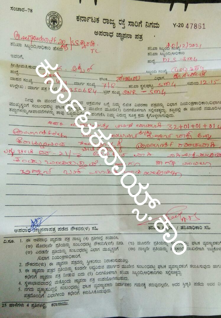 ರೊಟ್ಟಿಯ ಬಾಕ್ಸ್ ಗೆ 21 ರೂಪಾಯಿ ಲಗೇಜ್ ದರ ಪಡೆದುಕೊಳ್ಳಬೇಕಿತ್ತು. ಬಸ್ ತಪಾಸಣೆ ವೇಳೆಯಲ್ಲಿ ಇಲಾಖೆಯ ಅಧಿಕಾರಿಗಳು ನೋಟಿಸ್ ನೀಡಿದ್ದು, ಇಲಾಖೆಯಲ್ಲಿ ಆತಂರಿಕ ಭಿನ್ನಾಬಿಪ್ರಾಯಕ್ಕೆ ಕಾರಣವಾಗುತ್ತಿದೆ.