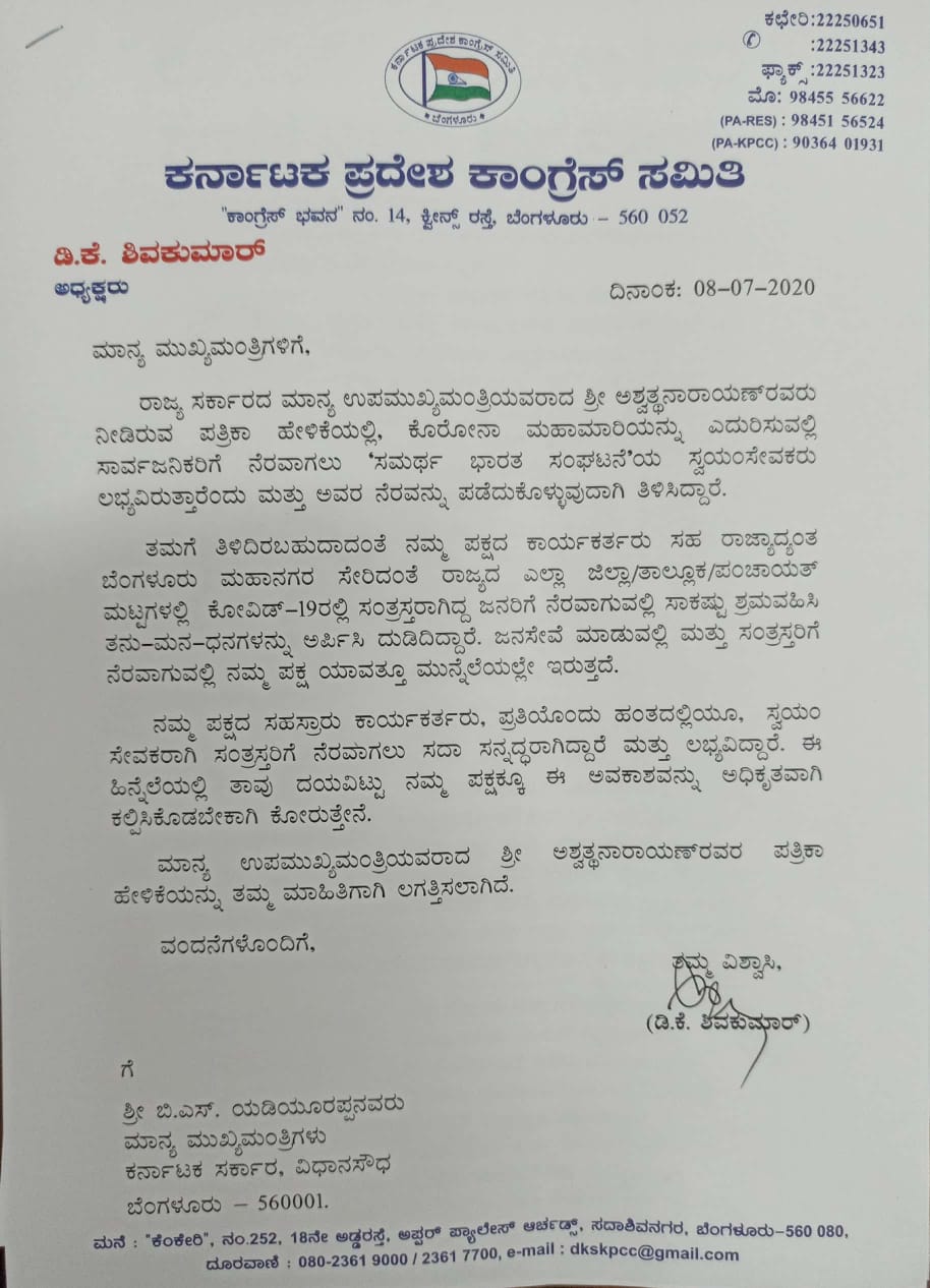 ಇತ್ತೀಚೆಗೆ ಬೆಂಗಳೂರಿನಲ್ಲಿ ಕೊರೋನಾ ನಿರ್ವಹಣೆಗೆ ಬಿಜೆಪಿ ಕಾರ್ಯಕರ್ತರನ್ನು (ಕೊರೊನಾ ವಾರಿಯರ್ಸ್) ಬಳಸಿಕೊಳ್ಳುವುದಾಗಿ ಉಪಮುಖ್ಯಮಂತ್ರಿ ಅಶ್ವತ್ಥ್ ನಾರಾಯಣ ಅವರು ನೀಡಿದ್ದ ಹೇಳಿಕೆ ಹಿನ್ನೆಲೆಯಲ್ಲಿ ಸಿಎಂಗೆ ಪತ್ರ ಬರೆದಿರುವ ಶಿವಕುಮಾರ್, ಹೇಳಿರುವುದಿಷ್ಟು: