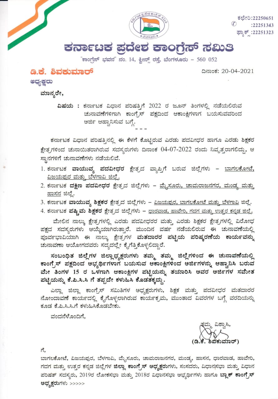 ಬೆಂಗಳೂರು: ಕರ್ನಾಟಕ ವಿಧಾನಪರಿಷತ್ತಿಗೆ 2022ರ ಜೂನ್ ತಿಂಗಳಲ್ಲಿ ನಡೆಯಲಿರುವ ಚುನಾವಣೆಗಾಗಿ ಕಾಂಗ್ರೆಸ್ ಪಕ್ಷದಿಂದ ಆಕಾಂಕ್ಷಿಗಳಾಗ ಬಯಸುವವರಿಂದ ಅರ್ಜಿಗಳನ್ನ ಪಡೆಯಲು ಕೆಪಿಸಿಸಿ ಅಧ್ಯಕ್ಷ ಡಿ.ಕೆ.ಶಿವುಕುಮಾರ ಅವರು ಜಿಲ್ಲಾಧ್ಯಕ್ಷರಿಗೆ ಸೂಚನೆ ನೀಡಿದ್ದಾರೆ.