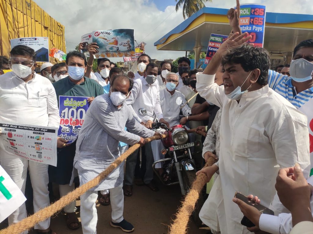 ಹುಬ್ಬಳ್ಳಿ: ಪೆಟ್ರೋಲ್ ದರ ಹೆಚ್ಚಾದ ಹಿನ್ನೆಲೆಯಲ್ಲಿ ಕಾಂಗ್ರೆಸ್ ನಗರದಲ್ಲಿಂದು ಹೋರಾಟ ನಡೆಸಿತ್ತು. ಅಚ್ಚೇದಿನ್ ಪ್ರಶ್ನಿಸುವ ಭರಾಟೆಯಲ್ಲಿ ಕೊರೋನಾ ನಿಯಮಾವಳಿಗಳನ್ನ ಗಾಳಿಗೆ ತೂರಿದ ಘಟನೆ ನಡೆದಿದೆ.