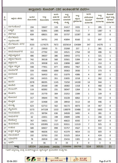 ಬೆಂಗಳೂರು: ರಾಜ್ಯದಲ್ಲಿಂದು ಹೊಸದಾಗಿ ಮತ್ತೆ 18324 ಕೊರೋನಾ ಪ್ರಕರಣಗಳು ಪತ್ತೆಯಾಗಿದ್ದು, 24036 ಸೋಂಕಿತರು ಗುಣಮುಖರಾಗಿದ್ದಾರೆ. ರಾಜ್ಯಾಧ್ಯಂತ 514 ಸೋಂಕಿತರು ಚಿಕಿತ್ಸೆ ಫಲಿಸದೇ ಸಾವಿಗೀಡಾಗಿದ್ದಾರೆಂದು ಇಲಾಖೆ ಮಾಹಿತಿ ನೀಡಿದೆ.