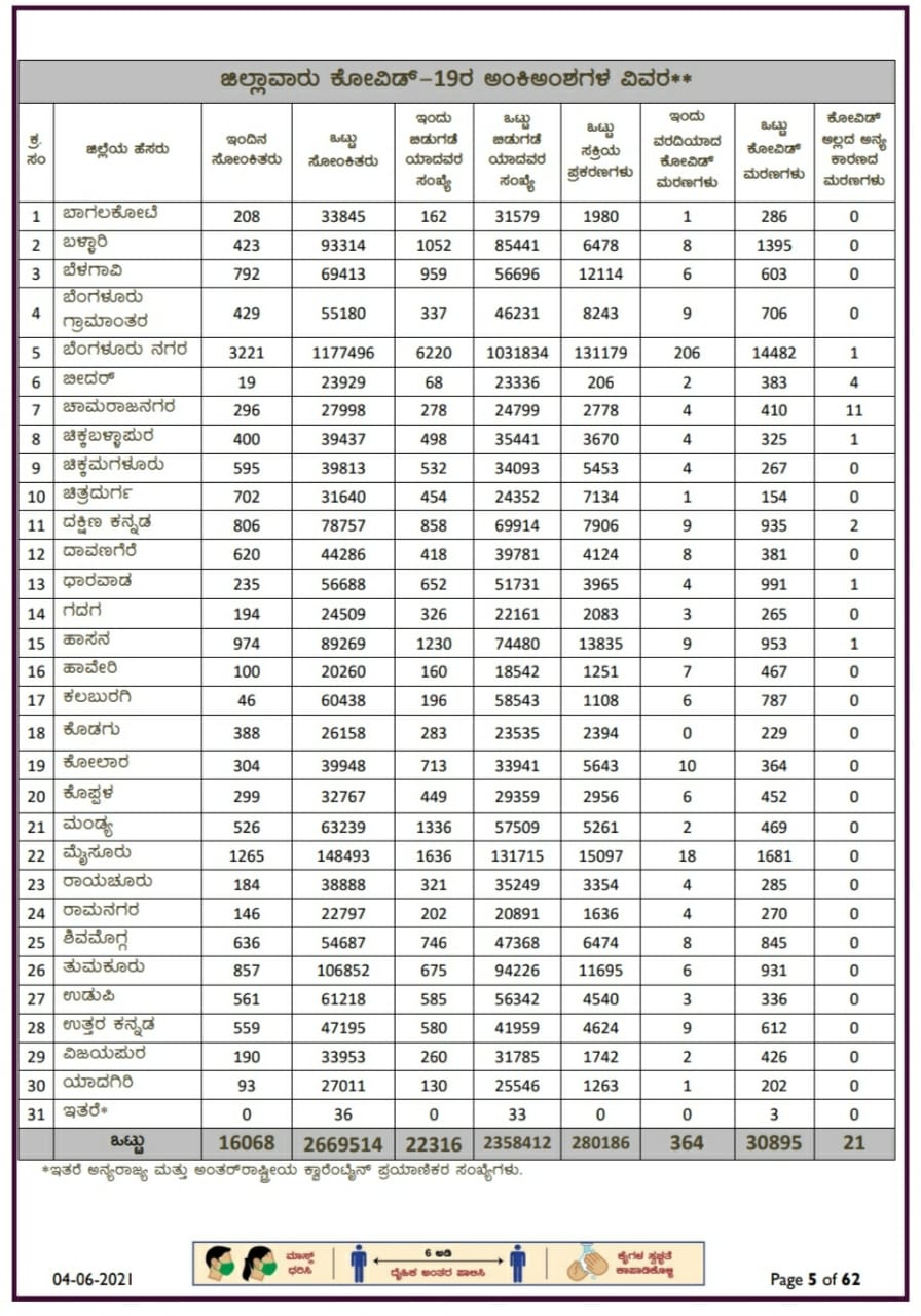ಬೆಂಗಳೂರು: ರಾಜ್ಯದಲ್ಲಿ ಇಂದು ಮತ್ತೆ 16068 ಪಾಸಿಟಿವ್ ಪ್ರಕರಣಗಳು ಪತ್ತೆಯಾಗಿದ್ದು, 22316 ಸೋಂಕಿತರು ಗುಣಮುಖರಾಗಿದ್ದು, 364 ಸೋಂಕಿತರು ಚಿಕಿತ್ಸೆ ಫಲಿಸದೇ ಸಾವಿಗೀಡಾಗಿದ್ದಾರೆ.