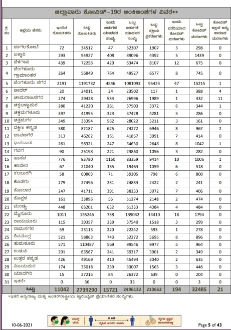 ಬೆಂಗಳೂರು: ಕೊರೋನಾ ಪ್ರಕರಣಗಳ ವಿವರವನ್ನ ಬಿಡುಗಡೆ ಮಾಡಲಾಗಿದ್ದು, ಇಂದು ಕೂಡಾ ರಾಜ್ಯದಲ್ಲಿ 11042 ಹೊಸ ಕೊರೋನಾ ಪಾಸಿಟಿವ್ ಪ್ರಕರಣಗಳು ಪತ್ತೆಯಾಗಿದ್ದು, 15721 ಸೋಂಕಿತರು ಗುಣಮುಖ- 194 ಸೋಂಕಿತರ ಸಾವಿಗೀಡಾಗಿದ್ದಾರೆ.