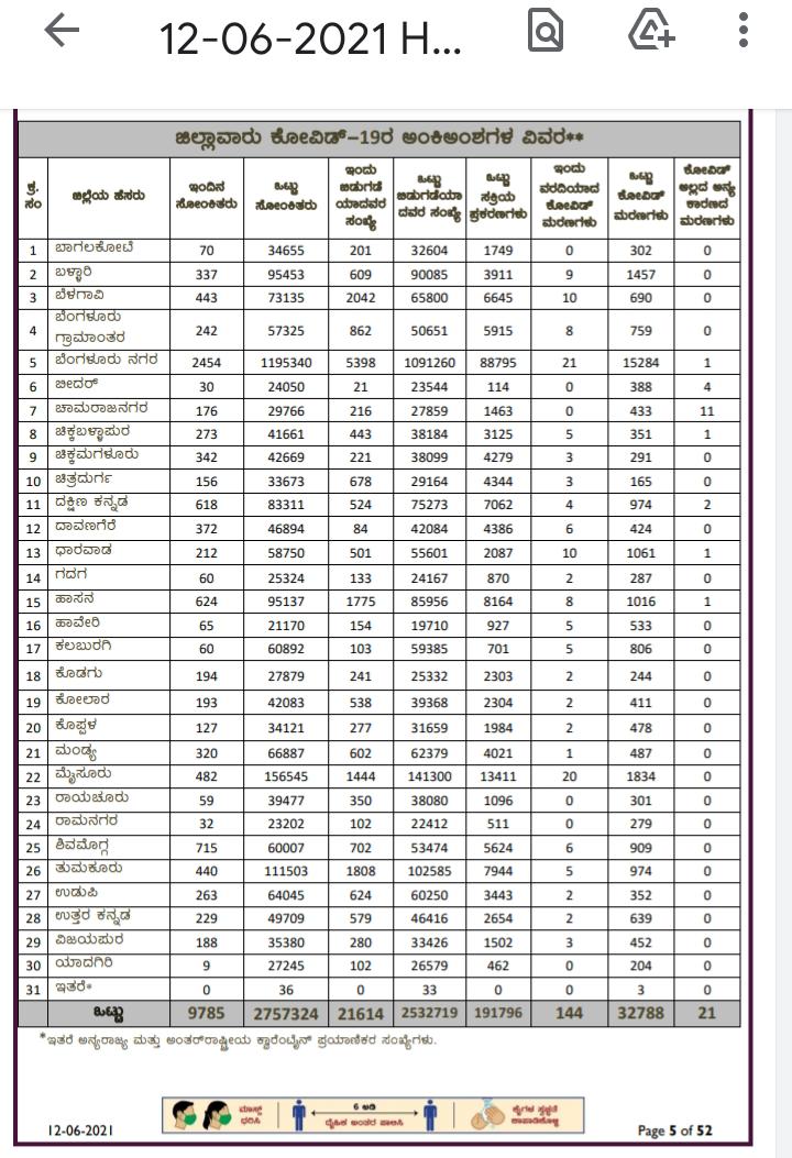 ರಾಜ್ಯದಲ್ಲಿ ಪ್ರಕರಣಗಳು ಇಳಿಮುಖವಾಗುತ್ತಿದ್ದು, ರಾಜ್ಯಾಧ್ಯಂತ 191796 ಸಕ್ರಿಯ ಪ್ರಕರಣಗಳಿವೆ. ರಾಜ್ಯದಲ್ಲಿ ಕೊರೋನಾದಿಂದಲೇ 32788 ಸೋಂಕಿತರು ಸಾವಿಗೀಡಾಗಿದ್ದಾರೆ.