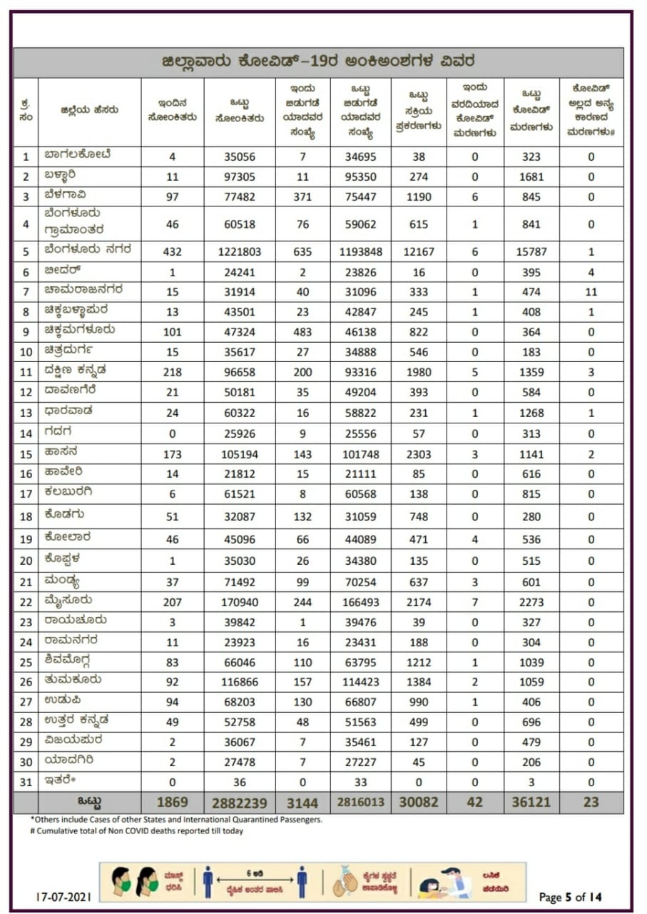 ಬೆಂಗಳೂರು ನಗರದಲ್ಲಿ 432 ಹೊಸ ಪ್ರಕರಣಗಳು ಪತ್ತೆಯಾಗಿದ್ದು, 6 ಸೋಂಕಿತರು ಸಾವಿಗೀಡಾಗಿದ್ದಾರೆ. ದಕ್ಷಿಣ ಕನ್ನಡದಲ್ಲಿ 218, ಮೈಸೂರು 207, ಹಾಸನದಲ್ಲಿ 173, ಚಿಕ್ಕಮಗಳೂರಿನಲ್ಲಿ 101 ಪ್ರಕರಣಗಳು ಪತ್ತೆಯಾಗಿವೆ.