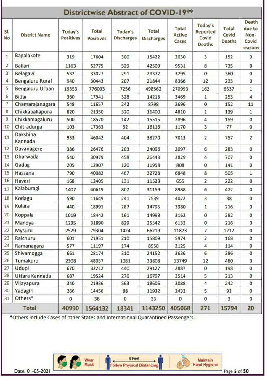 ಬೆಂಗಳೂರು: ರಾಜ್ಯದಲ್ಲಿಂದು 40990 ಕೊರೋನಾ ಪಾಸಿಟಿವ್ ಪ್ರಕರಣಗಳು ಪತ್ತೆಯಾಗಿದ್ದು, 271 ಸೋಂಕಿತರು ಸಾವಿಗೀಡಾಗಿದ್ದಾರೆ. ರಾಜ್ಯದಲ್ಲಿ 18341 ಸೋಂಕಿತರು ಆಸ್ಪತ್ರೆಯಿಂದ ಬಿಡುಗಡೆ ಹೊಂದಿದ್ದಾರೆ.