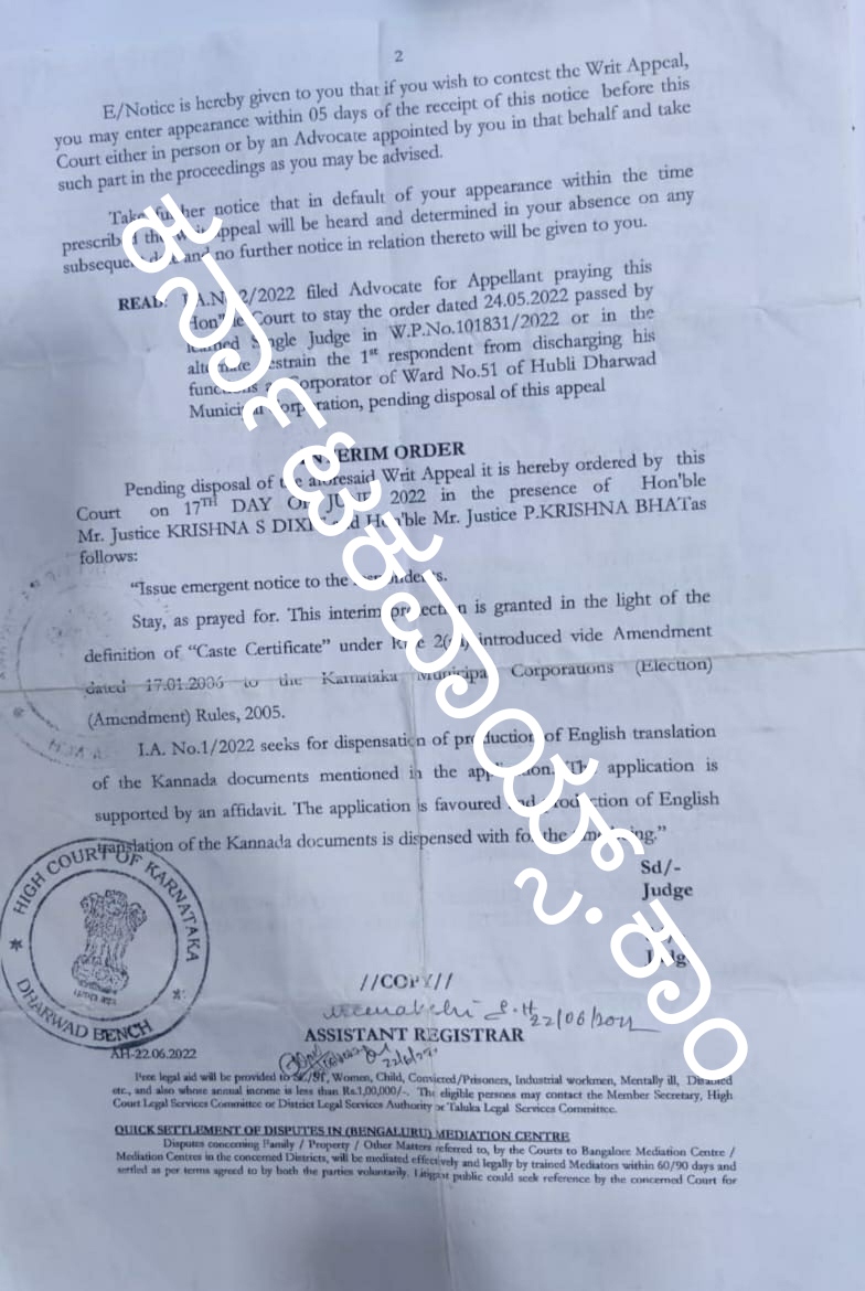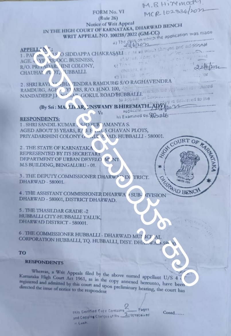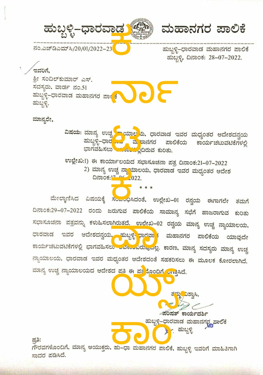 ಹುಬ್ಬಳ್ಳಿ: ಮಹಾನಗರ ಪಾಲಿಕೆಯ ಯಾವುದೇ ಚಟುವಟಿಕೆಯಲ್ಲೂ ಪಾಲಿಕೆ ಸದಸ್ಯನಾಗಿ ಭಾಗವಹಿಸಲು ಅವಕಾಶವಿಲ್ಲವೆಂದು ನೋಟೀಸ್ ನೀಡಿರುವ ಮಾಹಿತಿಯ ಪ್ರತಿ ಕರ್ನಾಟಕವಾಯ್ಸ್.ಕಾಂ ಗೆ ಲಭಿಸಿದೆ.