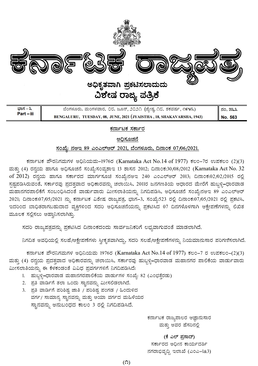 ಬೆಂಗಳೂರು: ಕೆಲವು ದಿನಗಳ ಹಿಂದೆ ಹುಬ್ಬಳ್ಳಿ-ಧಾರವಾಡ ಮಹಾನಗರ ಪಾಲಿಕೆಯ 82 ವಾರ್ಡುಗಳ ಪೈಕಿ, ಆಕ್ಷೇಪಣೆಗಳಿದ್ದರೇ ಸಲ್ಲಿಸುವಂತೆ ಸೂಚನೆ ನೀಡಲಾಗಿತ್ತು. ಇದೀಗ ಆಕ್ಷೇಪಣೆಗಳನ್ನ ಪರಿಗಣನೆಗೆ ತೆಗೆದುಕೊಂಡು ಹೊಸ ಮೀಸಲಾತಿಯನ್ನ ಪ್ರಕಟಿಸಲಾಗಿದೆ.