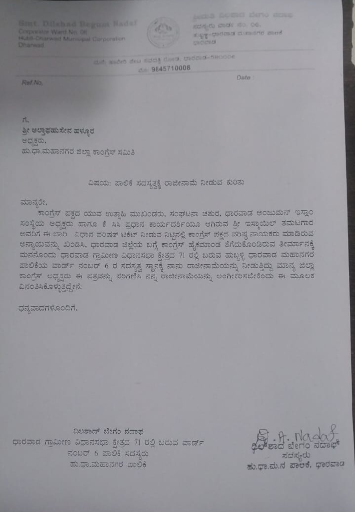 ಟಿಕೆಟ್ ನೀಡುವ ನಿಟ್ಟಿನಲ್ಲಿ ಕಾಂಗ್ರೆಸ್ ಪಕ್ಷದ ವರಿಷ್ಠ ನಾಯಕರು ಮಾಡಿರುವ ಅನ್ಯಾಯವನ್ನು ಖಂಡಿಸಿ, ಧಾರವಾಡ ಜಿಲ್ಲೆಯ ಬಗ್ಗೆ ಕಾಂಗ್ರೆಸ್ ಹೈಕಮಾಂಡ ತೆಗೆದುಕೊಂಡಿರುವ ತೀರ್ಮಾನಕ್ಕೆ ಮನನೊಂದು ಹುಬ್ಬಳ್ಳಿ ಧಾರವಾಡ ಮಹಾನಗರ ಪಾಲಿಕೆಯ ವಾರ್ಡ ನಂ 06 ರ ಸದಸ್ಯತ್ವ ಸ್ಥಾನಕ್ಕೆ ನಾನು ರಾಜೀನಾಮೆಯನ್ನು ನೀಡುತ್ತಿದ್ದು ಮಾನ್ಯ ಜಿಲ್ಲಾ ಕಾಂಗ್ರೆಸ್ ಅಧ್ಯಕ್ಷರು ಈ ಪತ್ರವನ್ನು ಪರಿಗಣಿಸಿ ನನ್ನ ರಾಜೀನಾಮೆಯನ್ನು ಅಂಗೀಕರಿಸಬೇಕೆಂದು ಈ ಮೂಲಕ ವಿನಂತಿಸಿಕೊಳ್ಳುತ್ತಿದ್ದೇನೆ.