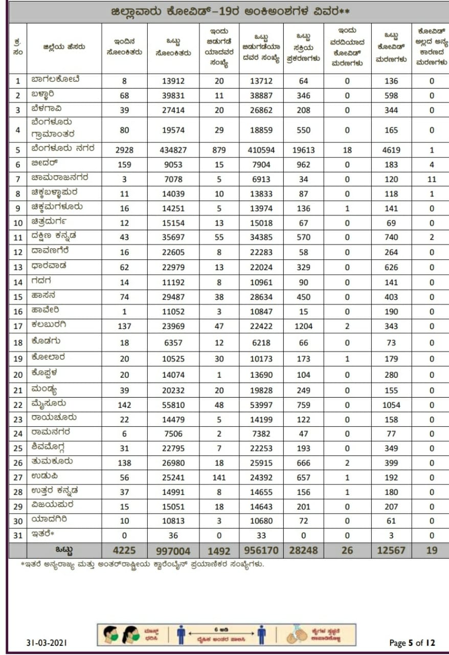 ಒಟ್ಟು 4225 ಪಾಸಿಟಿವ್ ಪ್ರಕರಣಗಳ ಪೈಕಿ ಬೆಂಗಳೂರು ಶಹರದಲ್ಲಿ 2928 ಪ್ರಕರಣಗಳು ಪತ್ತೆಯಾಗಿದ್ದು, ಗ್ರಾಮೀಣ ಭಾಗದಲ್ಲಿ 80 ಪಾಸಿಟಿವ್ ಪ್ರಕರಣಗಳು ಪತ್ತೆಯಾಗಿವೆ. ಬೀದರನಲ್ಲಿ 159, ಕಲಬುರಗಿಯಲ್ಲಿ 137, ಮೈಸೂರಲ್ಲಿ 142, ತುಮಕೂರಲ್ಲಿ 138 ಪ್ರಕರಣಗಳು ಪತ್ತೆಯಾಗಿವೆ.