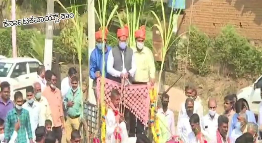 ಗ್ರಾಮಕ್ಕೆ ಬರುತ್ತಿದ್ದ ಹಾಗೇ ಗ್ರಾಮಸ್ಥರು, ಗೌರವಪೂರ್ವಕವಾಗಿ ಬರಮಾಡಿಕೊಂಡರು. ಸಿಂಗರಿಸಿದ್ದ ಚಕ್ಕಡಿಯಲ್ಲಿ ಹತ್ತಿದ ಜಿಲ್ಲಾಧಿಕಾರಿ ನಿತೇಶ ಪಾಟೀಲ ಅವರು, ಎತ್ತಿನ ಹಗ್ಗವನ್ನ ತಾವೇ ಹಿಡಿದು ಮುನ್ನಡೆಸಿದರು.