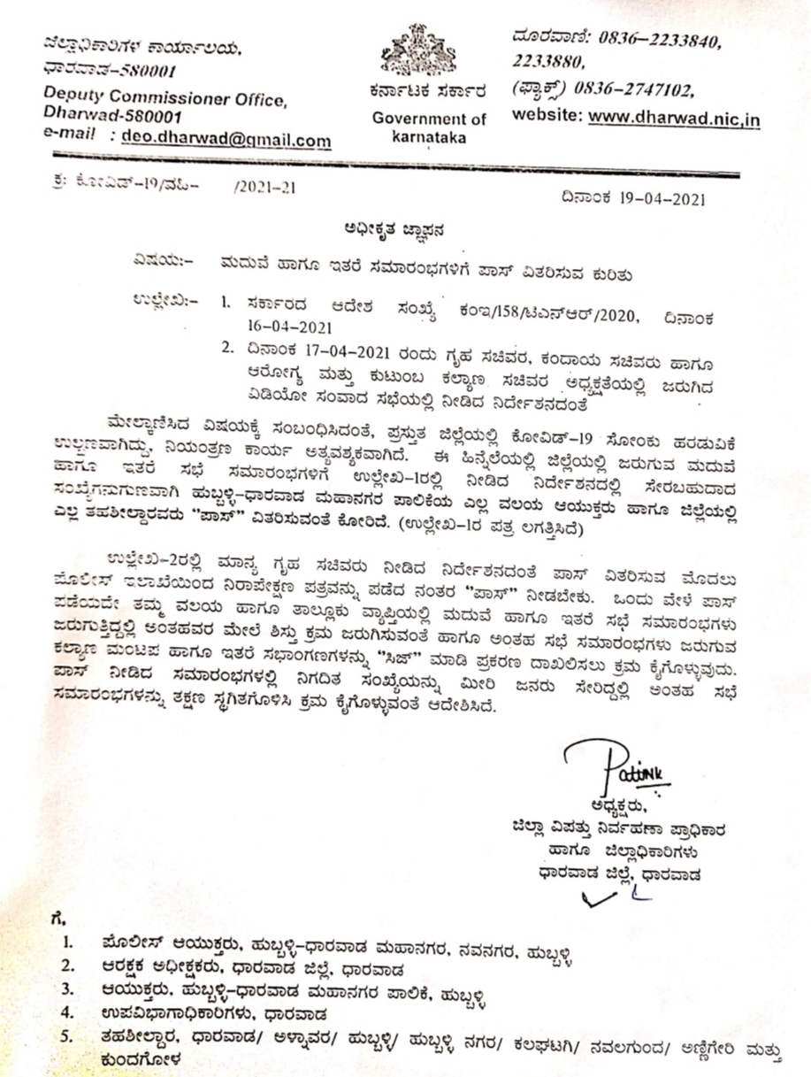 ಧಾರವಾಡ: ಜಿಲ್ಲೆಯಲ್ಲಿ ಮದುವೆಯೂ ಸೇರಿದಂತೆ ಇನ್ನುಳಿದ ಇತರೆ ಕಾರ್ಯಕ್ರಮಗಳಿಗೆ ಪಾಸ್ ಪಡೆದುಕೊಂಡು ನಡೆಸಬೇಕೆಂದು ಧಾರವಾಡ ಜಿಲ್ಲಾಧಿಕಾರಿ ನಿತೇಶ ಪಾಟೀಲ ಇಂದು ಆದೇಶ ಹೊರಡಿಸಿದ್ದಾರೆ.