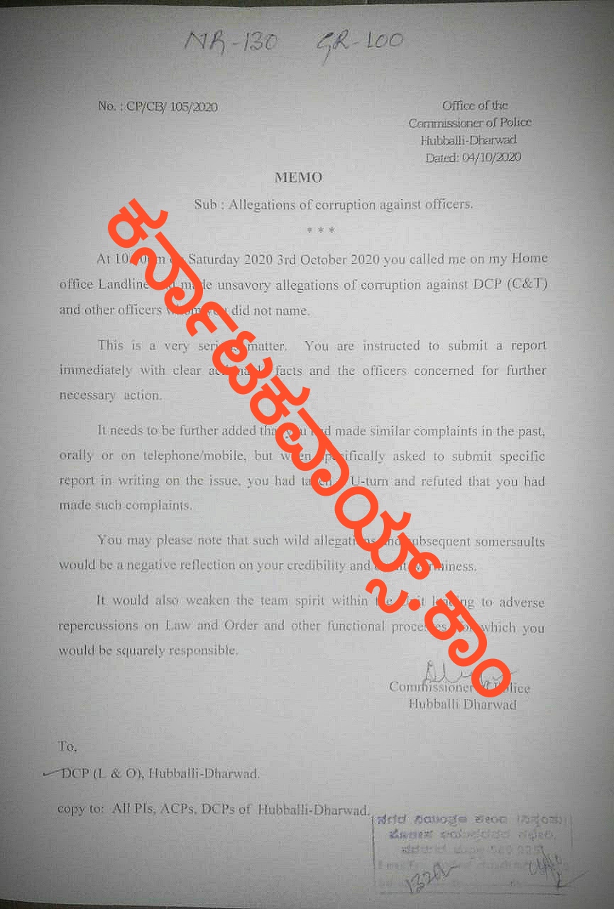 ಹುಬ್ಬಳ್ಳಿ: ಕಮೀಷನರೇಟ್ ವ್ಯಾಪ್ತಿಯಲ್ಲಿ ಪೊಲೀಸ್ ಕಮೀಷನರ್ ಆರ್.ದಿಲೀಪ್ ಹಾಗೂ ಡಿಸಿಪಿ ಪಿ.ಕೃಷ್ಣಕಾಂತ ನಡುವಿನ ಒಳಜಗಳ ಆರಂಭವಾಗಿದ್ದು ಹೇಗೆ ಎನ್ನುವುದಕ್ಕೆ ಮಹತ್ವವಾದ ಮೆಮೋವೊಂದು ವೈರಲ್ ಆಗಿದ್ದು, ಅದರಲ್ಲಿಯೇ ಎಲ್ಲವೂ ತಿಳಿಯುತ್ತೆ. ಆ ಪತ್ರದಲ್ಲಿ ಏನಿದೆ.. ಏನೇನು ಬರೆದಿದ್ದಾರೆ. ಡಿಸಿಪಿ ಕೃಷ್ಣಕಾಂತ, ಇನ್ನೋರ್ವ ಡಿಸಿಪಿ ಮೇಲೆ ಏನೂ ಆರೋಪ ಮಾಡಿದ್ರು..