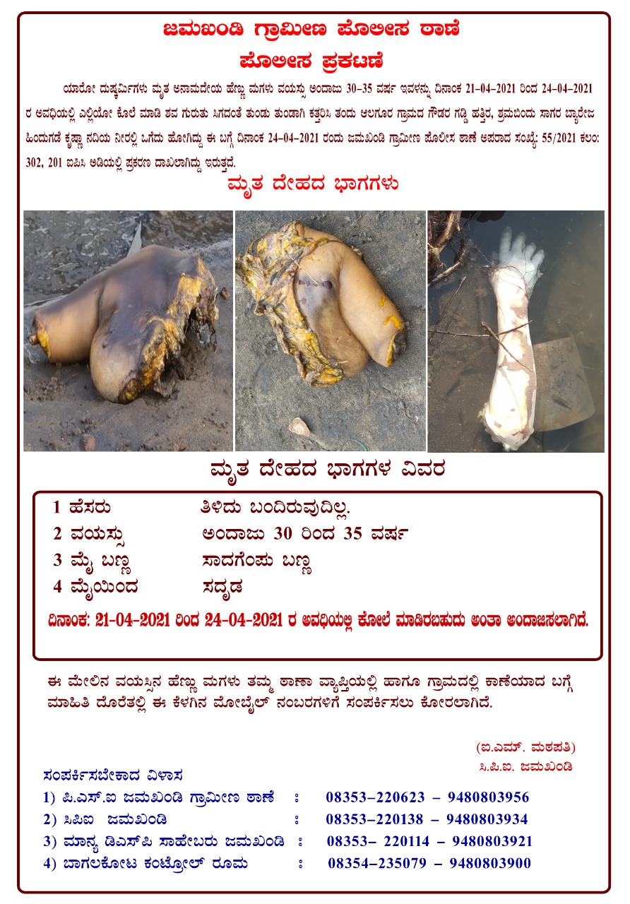 ಈ ಕುರಿತು ಪೊಲೀಸ್ ಪ್ರಕಟನೆಯನ್ನ ಹೊರಡಿಸಿರುವ ಜಮಖಂಡಿ ಗ್ರಾಮೀಣ ಠಾಣೆಯ ಪೊಲೀಸರು, ಭಾವಚಿತ್ರದಲ್ಲಿ ಕಂಡು ಬರುವ ದೇಹದ ಭಾಗಗಳನ್ನ ಗುರುತಿಸಿ, ಪತ್ತೆಯಾದರೇ ಮಾಹಿತಿ ನೀಡುವಂತೆ ಕೋರಿದ್ದಾರೆ.