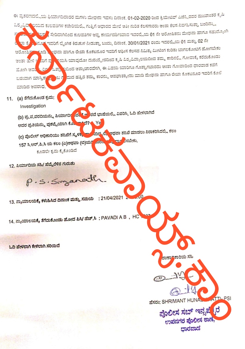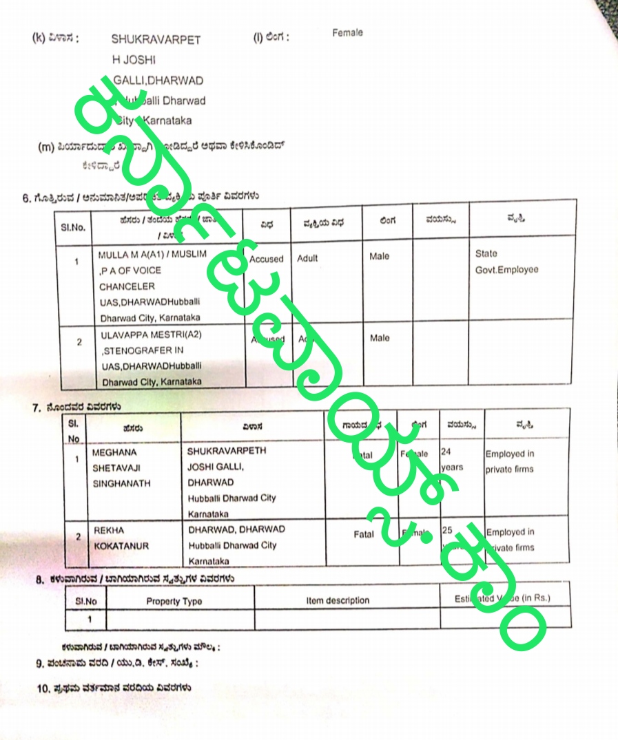 ಕರ್ನಾಟಕ ಕೃಷಿ ವಿಶ್ವವಿದ್ಯಾಲಯ ಕುಲಪತಿಯ ಆಪ್ತ ಸಹಾಯಕ ಮನಸೂರ ಮುಲ್ಲಾ ಹಾಗೂ ಕೃಷಿ ವಿಶ್ವವಿದ್ಯಾಲಯದ ಸ್ಟೇನೋಗ್ರಾಫರ್ ಉಳವಪ್ಪ ಮೇಸ್ತ್ರಿ ಮೇಲೆ ಐಪಿಸಿ 1860 (ಯು/ಎಸ್- 354(ಎ), 376, 302, 34) ಪ್ರಕರಣವನ್ನ ದಾಖಲು ಮಾಡಲಾಗಿದೆ.