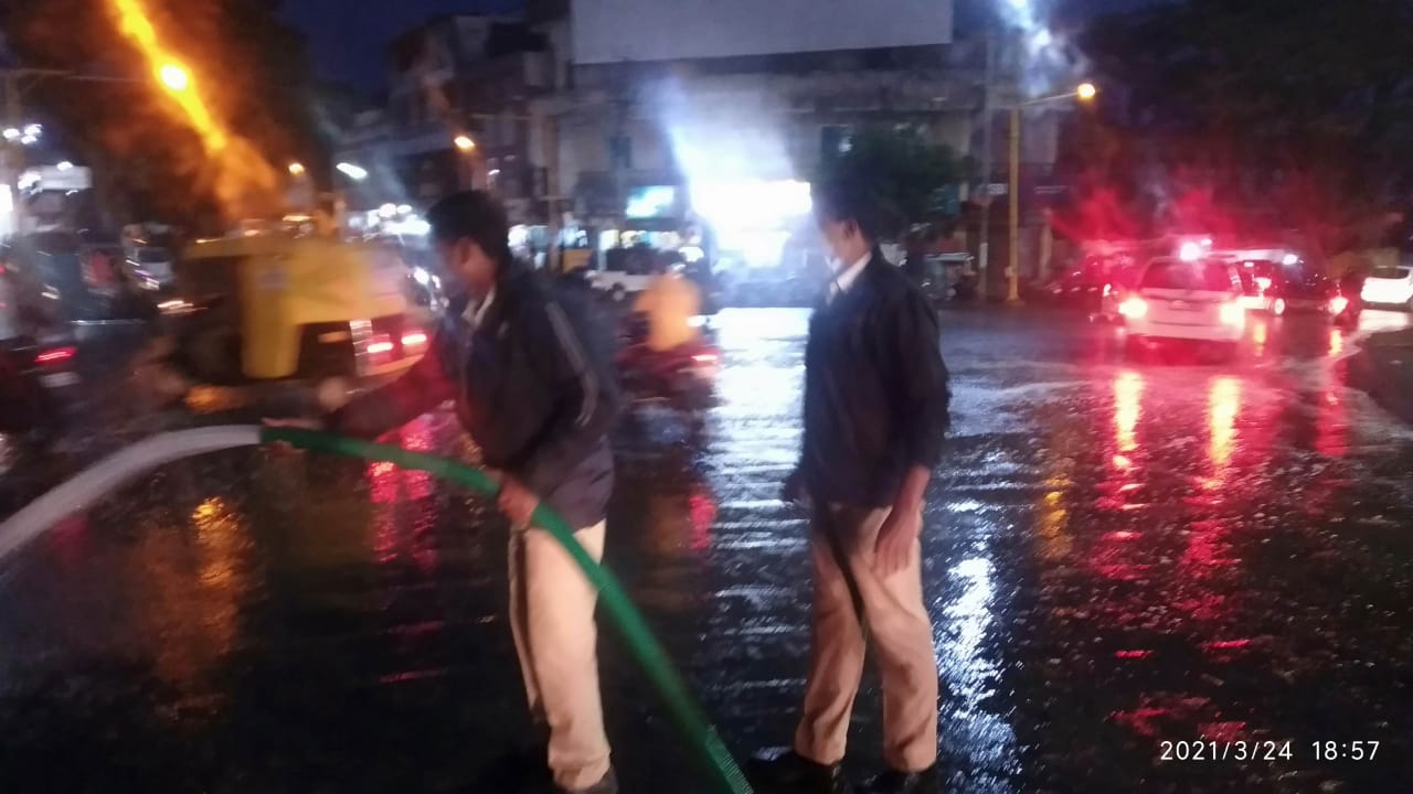 ಈ ವಿಷಯ ಗೊತ್ತಾದ ತಕ್ಷಣವೇ ಧಾರವಾಡ ಸಂಚಾರಿ ಠಾಣೆಯ ಎಂ.ವೈ.ಬಾಬಜಿ, ಡಿ.ವಿ.ಗಾಳರೆಡ್ಡಿ, ಐ.ಜಿ.ಕವಳಿ ಹಾಗೂ ಎಲ್.ಎಲ್.ನಾಯಕ ಅವರುಗಳು ಸೇರಿಕೊಂಡು, ರಸ್ತೆಗೆ ಟ್ರ್ಯಾಕ್ಟರನಿಂದ ನೀರು ಬಿಟ್ಟು ಸ್ವಚ್ಚಗೊಳಿಸಿದರು.
