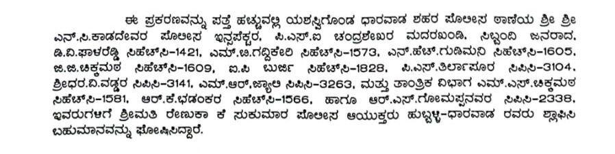 ಆರೋಪಿಯನ್ನ ಬಂಧಿಸುವಲ್ಲಿ ಈ ಪ್ರಕರಣವನ್ನು ಪತ್ತೆ ಹಚ್ಚುವಲ್ಲಿ ಧಾರವಾಡ ಶಹರ ಪೊಲೀಸ ಠಾಣೆಯ ಎನ್.ಸಿ.ಕಾಡದೇವರ ಪೊಲೀಸ ಇನ್ಸಪೆಕ್ಟರ. ಪಿ.ಎಸ್.ಐ ಚಂದ್ರಶೇಖರ ಮದರಖಂಡಿ, ಸಿಬ್ಬಂದಿ ಜನರಾದ. ಡಿ.ಬಿ.ಫಾಳರೆಡ್ಡಿ ಸಿಹೆಚ್-1421, ಮಂಜುನಾಥ ಗದ್ದಿಕೇರಿ ಸಿಹೆಚ್ಸಿ-1573, ಎನ್.ಹೆಚ್.ಗುಣಮನಿ ಸಿಹೆಚ್ಸಿ-1605. ಜಿ.ಜಿ.ಚಿಕ್ಕಮಠ ಸಿಹೆಚ್-1609, ಐ.ಪಿ ಬುರ್ಜಿ ಸಿಹೆಚ್-1828, ಪಿ.ಎಸ್.ತಿರ್ಲಾಪೂರ ಸಿಪಿಸಿ-3104, ಶ್ರೀಧರ.ಬಿ.ವಡ್ಡರ ಸಿಪಿಸಿ-3141, ಎಮ್.ಆರ್.ಪ್ಯಾಲಿ ಸಿಪಿಸಿ-3263, ಮತ್ತು ತಾಂತ್ರಿಕ ವಿಭಾಗ ಎಮ್.ಎಸ್.ಚಿಕ್ಕಮಠ ಸಿಹೆಚ್-1581, ಆರ್.ಕೆ.ಭಡಂಕರ ಸಿಹೆಚ್-1566, ಹಾಗೂ ಆರ್.ಎಸ್.ಗೋಮಪ್ಪನವರ ಸಿಪಿಸಿ-2338 ಯಶಸ್ವಿಯಾಗಿದ್ದಾರೆ. ಇವರುಗಳಿಗೆ ಪೊಲೀಸ್ ಕಮೀಷನರ್ ರೇಣುಕಾ ಕೆ ಸುಕುಮಾರ ಶ್ಲಾಘಿಸಿ ಬಹುಮಾನವನ್ನು ಘೋಷಿಸಿದ್ದಾರೆ.