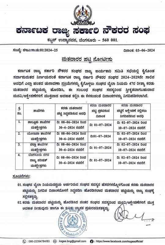 ರಾಜ್ಯ ಸಂಘದವರು ದಿ. 03-06-24 ರಂದು ಹೊರಡಿಸಿರುವ ಮತದಾರರ ಪಟ್ಟಿ ನೋಟಿಸನಲ್ಲಿ ತಾಲೂಕ ಮತ್ತು ಜಿಲ್ಲಾ ಘಟಕಗಳಿಗೆ ಮತದಾರರ ಕರಡು ಪ್ರತಿ ಪ್ರಕಟಸಲು ದಿ. 08-06-2024 ರಿಂದ 30-06-2024 ರವೆರೆಗೆ ಅವಧಿ ನಿಗದಿಪಡಿಸಿದ್ದು, ದಿ 01-07-2024 ರಂದು ಮತದಾರರ ಪಟ್ಟಿ ಪ್ರಕಟಿಸಲು ಹಾಗೂ ದಿ.10-07-2024ರವೆರೆಗೆ ಆಕ್ಷೇಪಣೆಗಳನ್ನು ಸಲ್ಲಿಸಲು ನಿಗದಿಪಡಿಸಲಾಗಿತ್ತು.