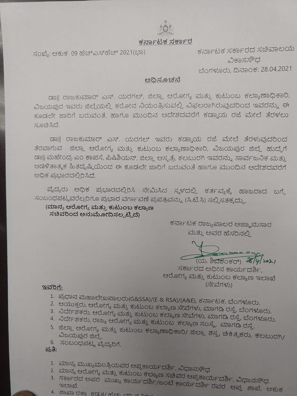 ಕೊರೋನಾ ಕುರಿತು ನಿರ್ಲಕ್ಷ್ಯ ವಹಿಸಿದ ಜಿಲ್ಲಾ ರಾಜಕುಮಾರ್ ಯರಗಲ್ ಅವರನ್ನೇ ಕಡ್ಡಾಯ ರಜೆ ಕಳಿಸಲು ಸರಕಾರ ಆದೇಶ ಹೊರಡಿಸಲಾಗಿದೆ. 4 ಬಾರಿ ಶೋಕಾಸ್ ನೋಟಿಸ್ ನೀಡಿ ಜಿಲ್ಲಾಧಿಕಾರಿ ಪಿ ಸುನೀಲ್ ಕುಮಾರ್ ಎಚ್ಚರಿಕೆ ನೀಡಿದ್ದರೂ, ಡಿಎಚ್ಓ ಸುಧಾರಣೆ ಕಂಡು ಬಂದಿರಲಿಲ್ಲ.