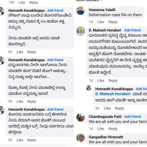 ಈ ನಡುವೆ ಮಾಜಿ ಮೇಯರ್ ಈರೇಶ ಅಂಚಟಗೇರಿ ಸಾಮಾಜಿಕ ಜಾಲತಾಣದಲ್ಲಿ ಡಾ.ಪ್ರಕಾಶ ರಾಮನಗೌಡರ ಪರವಾಗಿ ಬೆಂಬಲ ಸೂಚಿಸಿ, ತೇಜೋವಧೆ ಮಾಡುವ ದುಷ್ಟ ಶಕ್ತಿಗಳ ವಿರುದ್ಧ ನಿರ್ದಾಕ್ಷಣ್ಯ ಕ್ರಮ ಜರುಗಿಸಬೇಕೆಂದು ಆಗ್ರಹಿಸಿದ್ದರು.