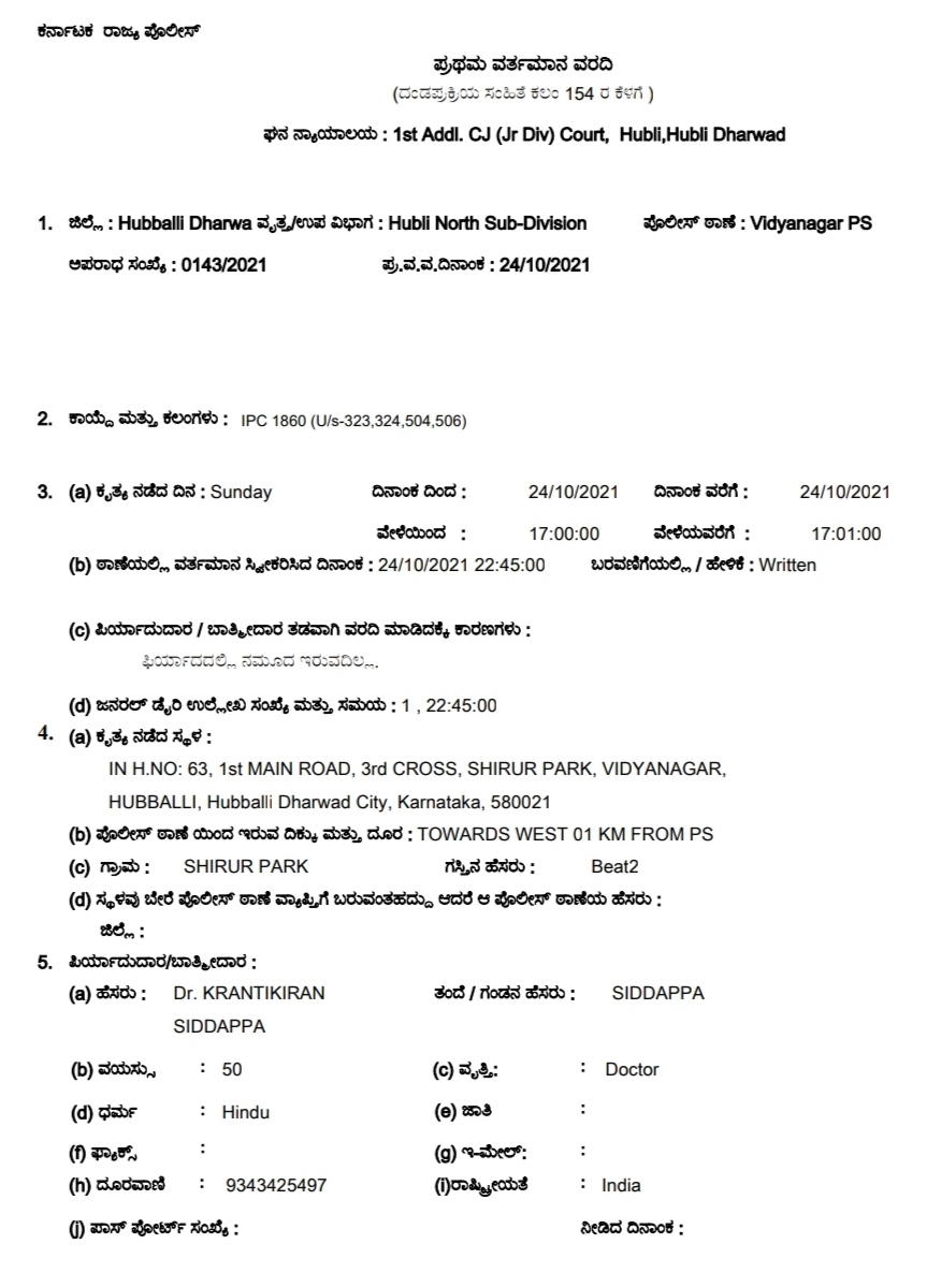 ಹುಬ್ಬಳ್ಳಿ: ನಗರದ ಶಿರೂರ ಪಾರ್ಕ್ ಪ್ರದೇಶದಲ್ಲಿರುವ ಮನೆಗೆ ನುಗ್ಗಿ ತಮ್ಮ ಮೇಲೆ ಕೈಯಿಂದ ಹಾಗೂ ಛತ್ರಿಯಿಂದ ಹೊಡೆದು ಜೀವ ಬೆದರಿಕೆ ಹಾಕಿದ್ದಾರೆಂದು ತಮ್ಮ ಪತ್ನಿಯ ವಿರುದ್ಧ ಹುಬ್ಬಳ್ಳಿಯ ವಿದ್ಯಾನಗರ ಪೊಲೀಸ್ ಠಾಣೆಯಲ್ಲಿ ಡಾ. ಕ್ರಾಂತಿ ಕಿರಣ ದೂರು ದಾಖಲು ಮಾಡಿರುವ ಪ್ರಕರಣ ಬೆಳಕಿಗೆ ಬಂದಿದೆ.
