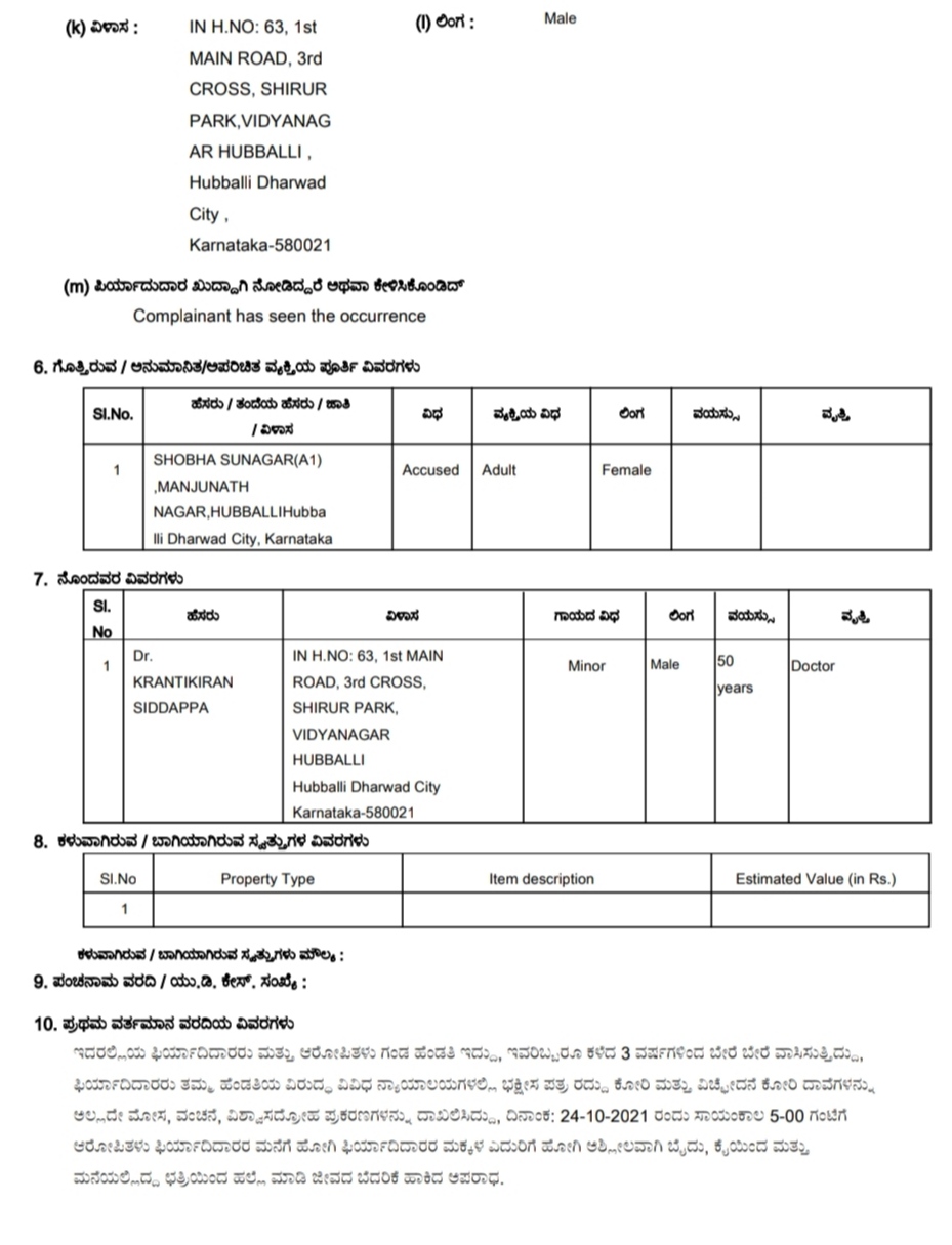 ಈಗಾಗಲೇ ಡಾ.ಕ್ರಾಂತಿಕಿರಣ ಅವರ ಪತ್ನಿ ಶೋಭಾ ಸುಣಗಾರ ನ್ಯಾಯಾಲಯದಲ್ಲಿ ಪ್ರಕರಣ ದಾಖಲು ಮಾಡಿದ್ದಾರೆಂಬುದನ್ನ ದೂರಿನಲ್ಲಿ ತಿಳಿಸಲಾಗಿದೆ. ಘಟನೆಗೆ ಸಂಬಂಧಿಸಿದಂತೆ ಪ್ರಕರಣ ದಾಖಲು ಮಾಡಿಕೊಂಡಿರೋ ವಿದ್ಯಾನಗರ ಠಾಣೆ ಪೊಲೀಸರು, ಶೋಭಾ ಸುಣಗಾರರ ಬಗ್ಗೆ ಮಾಹಿತಿಯನ್ನು ಕಲೆ ಹಾಕುತ್ತಿದ್ದಾರೆ.