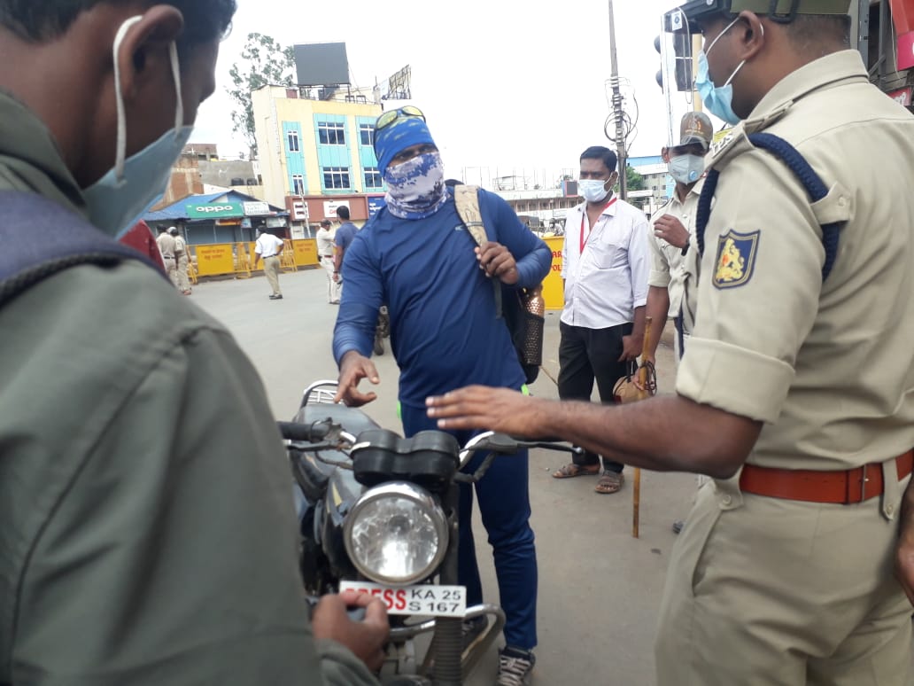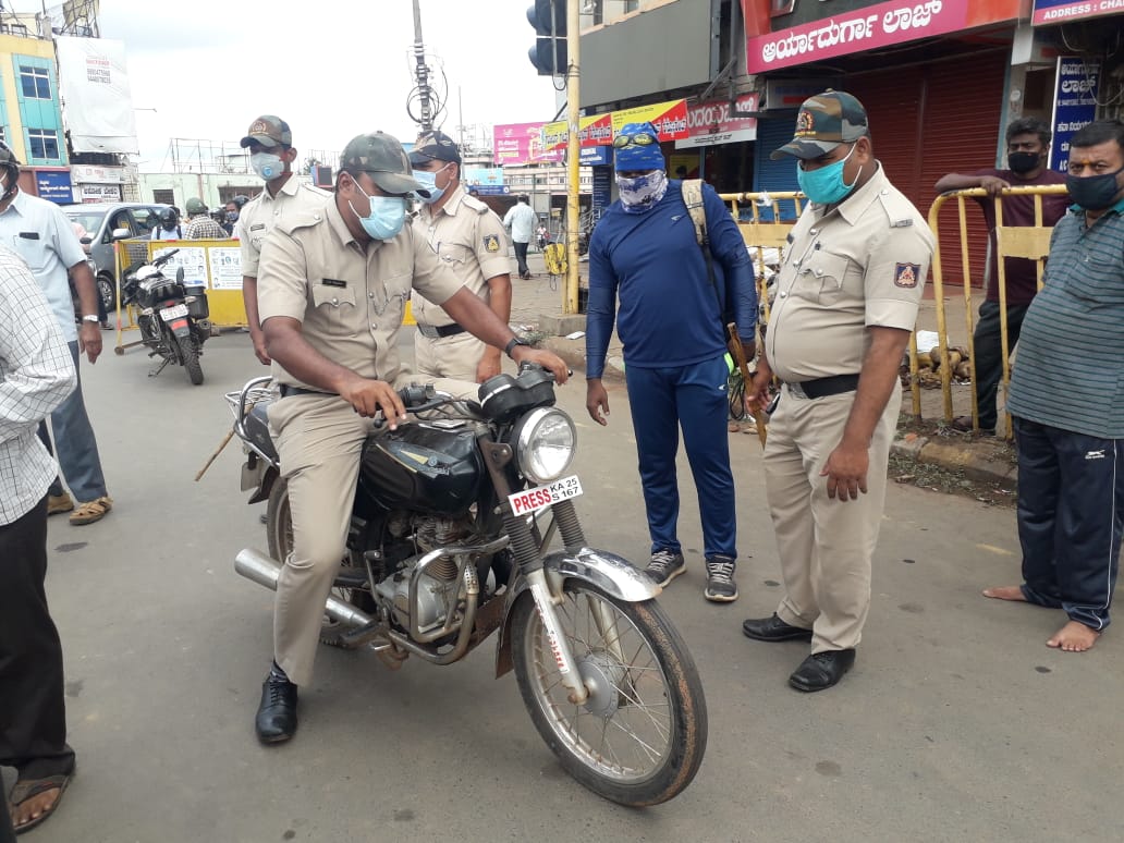 ಲಾಕ್ ಡೌನ್ ಹಿನ್ನೆಲೆ ಹುಬ್ಬಳ್ಳಿಯ ಚೆನ್ನಮ್ಮ ಸರ್ಕಲ್ ಬಳಿಯಲ್ಲಿ ಕರ್ತವ್ಯ ನಿರ್ವಹಿಸುತ್ತಿದ್ದಾಗ ಬೈಕ್ ಸವಾರನೊಬ್ಬ ತನ್ನ ಬೈಕಿಗೇ ಪ್ರೆಸ್ ಎಂದು ಬರೆಸಿಕೊಂಡು ತಿರುಗುತ್ತಿದ್ದ.