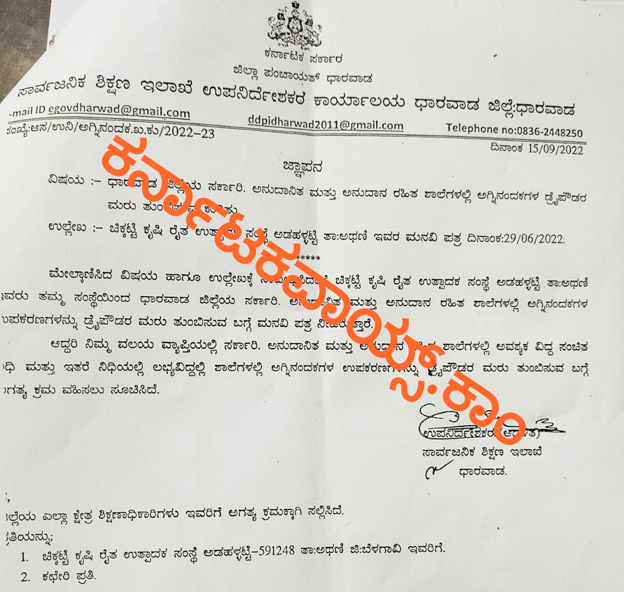 ಈ ಸಾಹಿತ್ಯದ ಹಿಂದೆ ಧಾರವಾಡ ಸಾರ್ವಜನಿಕ ಶಿಕ್ಷಣ ಇಲಾಖೆಯ ಉಪನಿರ್ದೇಶಕರಾದ ಕೆಳದಿಮಠ ಸಾಹೇಬ್ರು ಇತ್ತೀಚಿಗೆ ಆದೇಶ ಹೊರಡಿಸಿ ‘ಧಾರವಾಡ ಜಿಲ್ಲೆಯ ಎಲ್ಲ ಸರ್ಕಾರಿ, ಅನುದಾನಿತ ಮತ್ತು ಅನುದಾನ ರಹಿತ ಶಾಲೆಗಳಲ್ಲಿಯ ಅಗ್ನಿ ನಂದಕಗಳ ಡ್ರೈಪೌಡರ ಮರು ತುಂಬಿಸಲು ಅಥಣಿ ತಾಲೂಕಿನಲ್ಲಿಯ ಅಡಹಳ್ಳಟ್ಟಿಯಲ್ಲಿರುವ ಚಿಕ್ಕಟ್ಟಿ ಕೃಷಿ ಉತ್ಪಾದಕ ಸಂಸ್ಥೆಯಲ್ಲೇ ಮರು ತುಂಬಿಸಬೇಕೆಂದು ಆದೇಶಿಸಿದ್ದಾರೆ.
