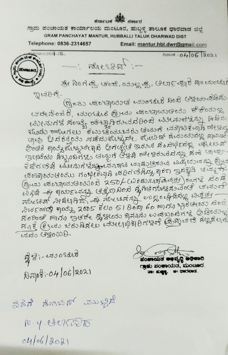 ಮಂಟೂರ ಗ್ರಾಮದ ಹೊರವಲಯದಲ್ಲಿನ ಕೆರೆಯಲ್ಲಿ ಮೀನುಗಳನ್ನ ಹಿಡಿದು ಅಲ್ಲಿಯೇ ಮಾರಾಟ ಮಾಡಿದ್ದ ಮಾಹಿತಿ ಕರ್ನಾಟಕವಾಯ್ಸ್.ಕಾಂ ಮೂಲಕ ಹೊರ ಬಿದ್ದ ಕೆಲವೇ ಸಮಯದಲ್ಲಿ ಪಿಡಿಓ ಅಶ್ವಿನಿಯವರು, ಮೀನು ಮಾರಾಟಗಾರ ನಿಂಗಪ್ಪ ತೀರ್ಲಾಪುರನಿಗೆ ನೋಟಿಸ್ ಜಾರಿ ಮಾಡಿದ್ದಾರೆ.